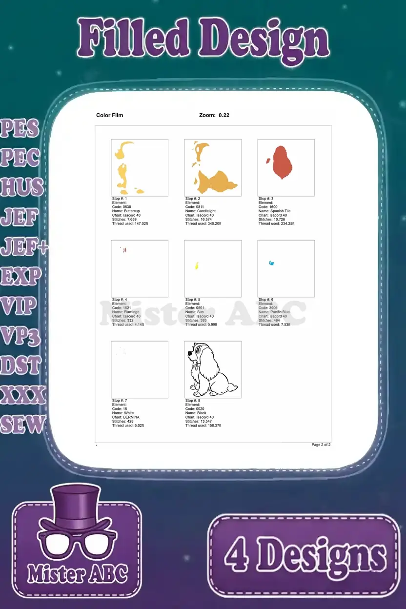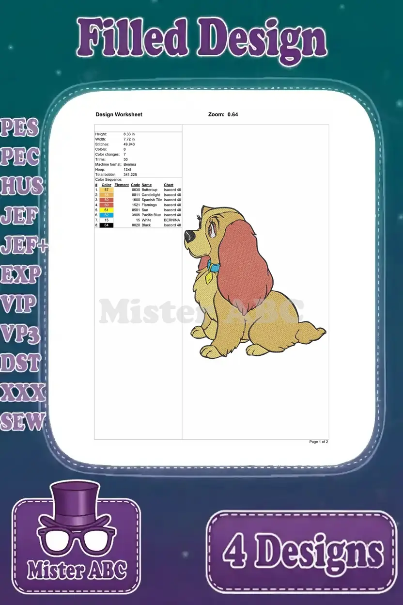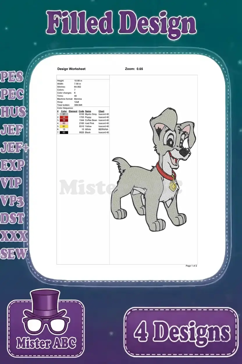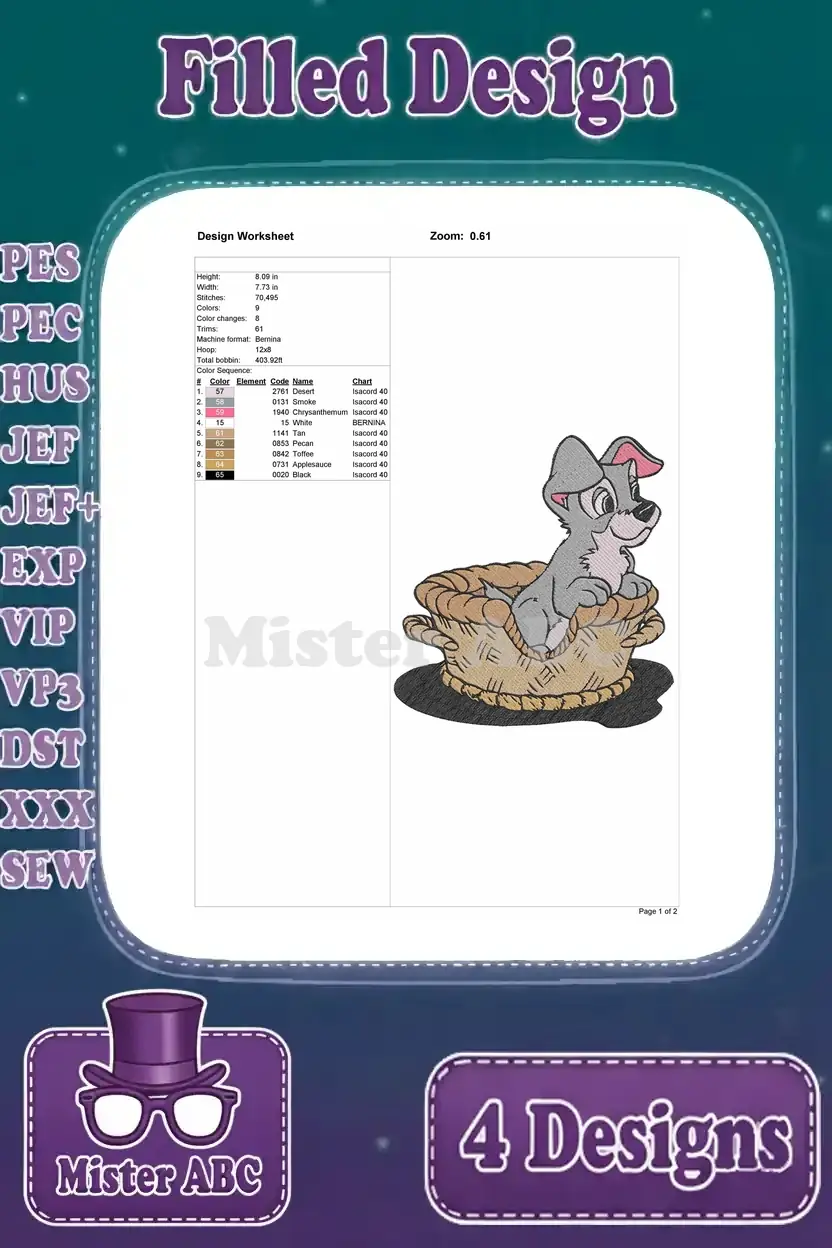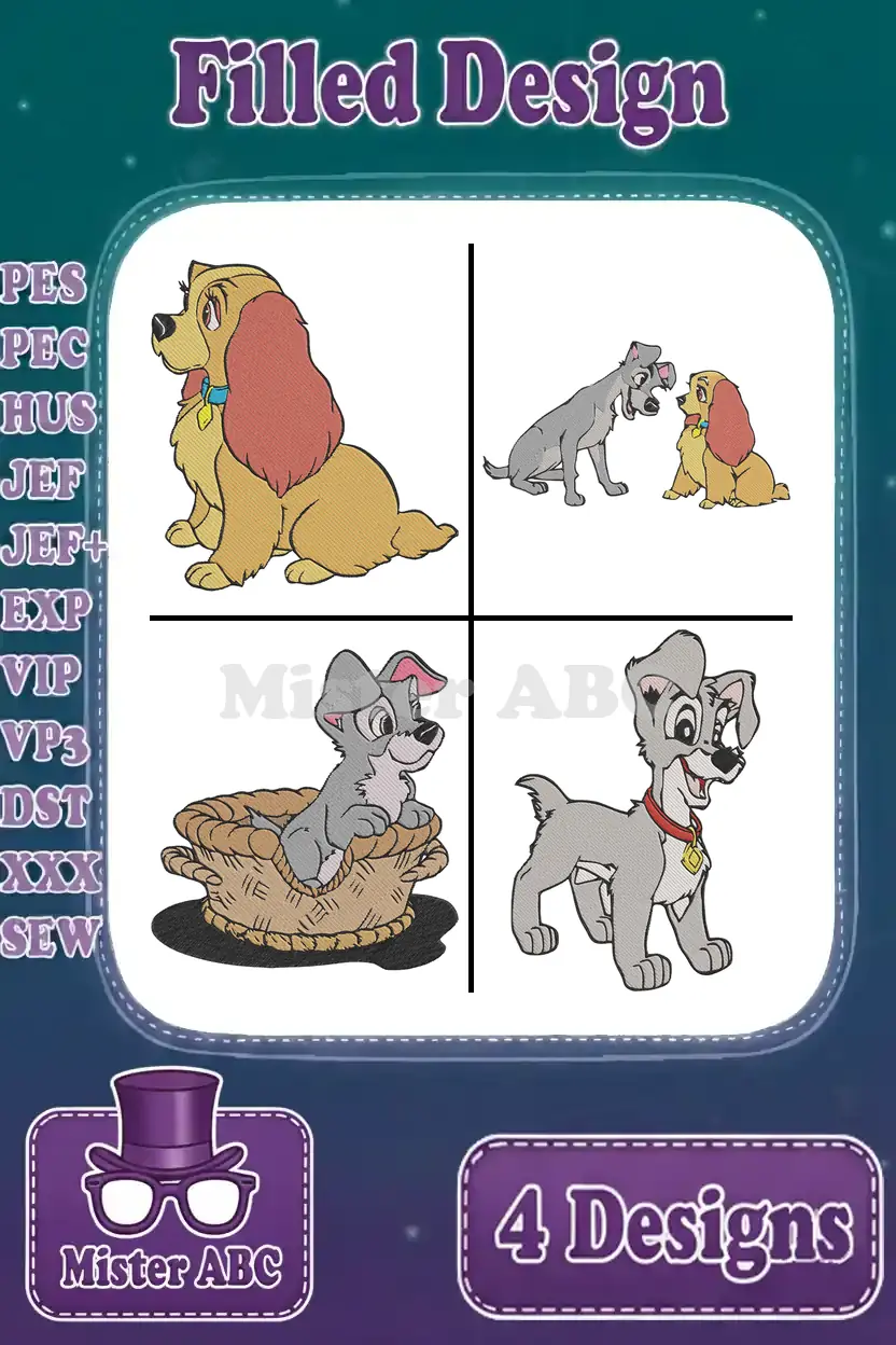 Lady And The Tramp – Lady – Scamp In Basket – Jock And Trusty Friends – Classic Dog Pack – Filled Embroidery Design