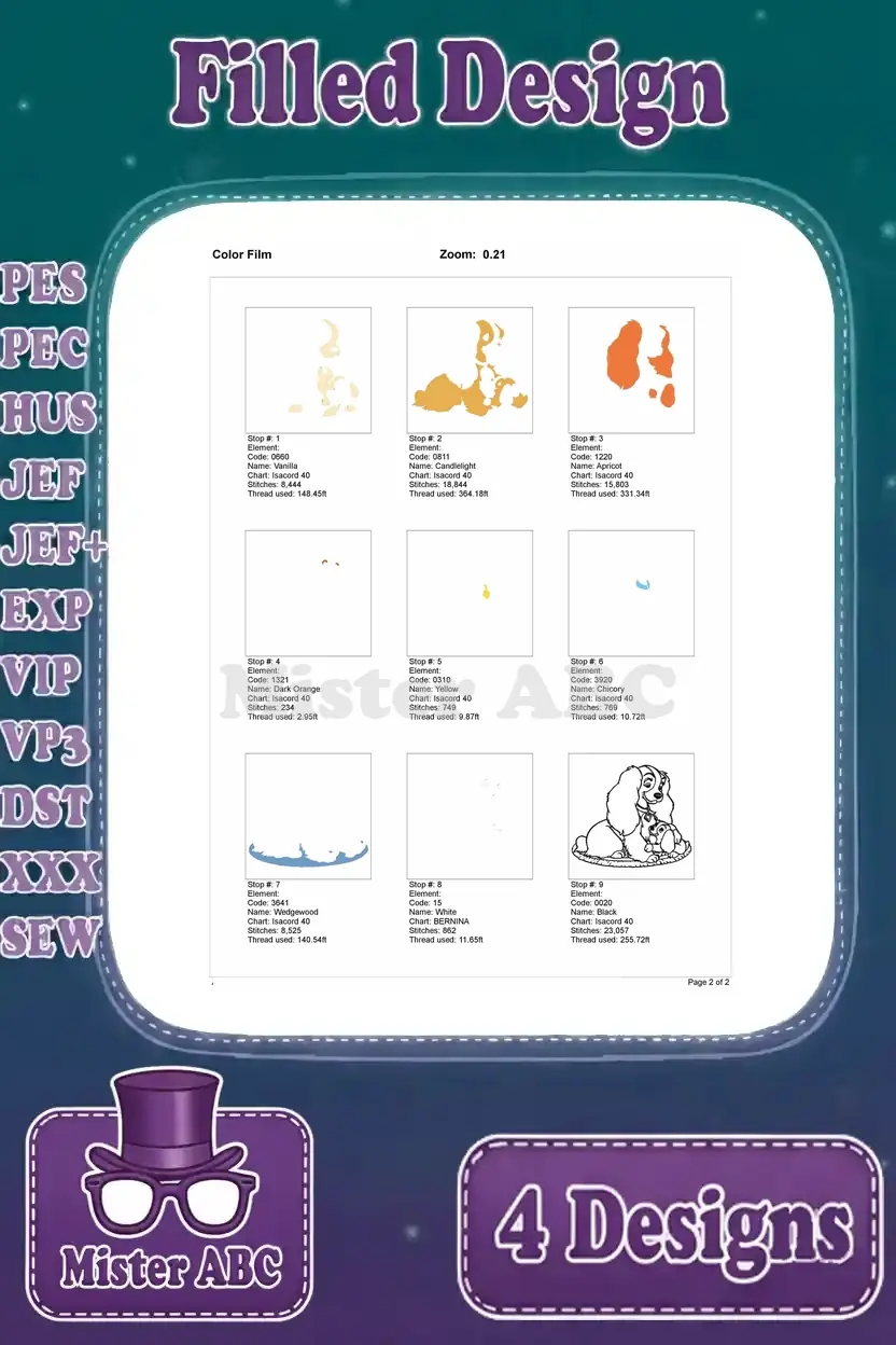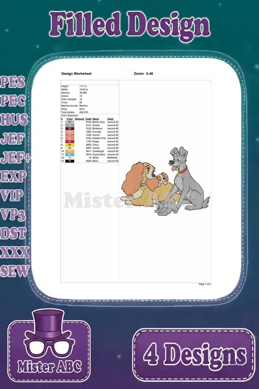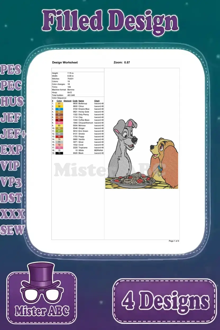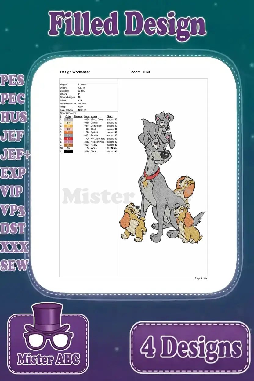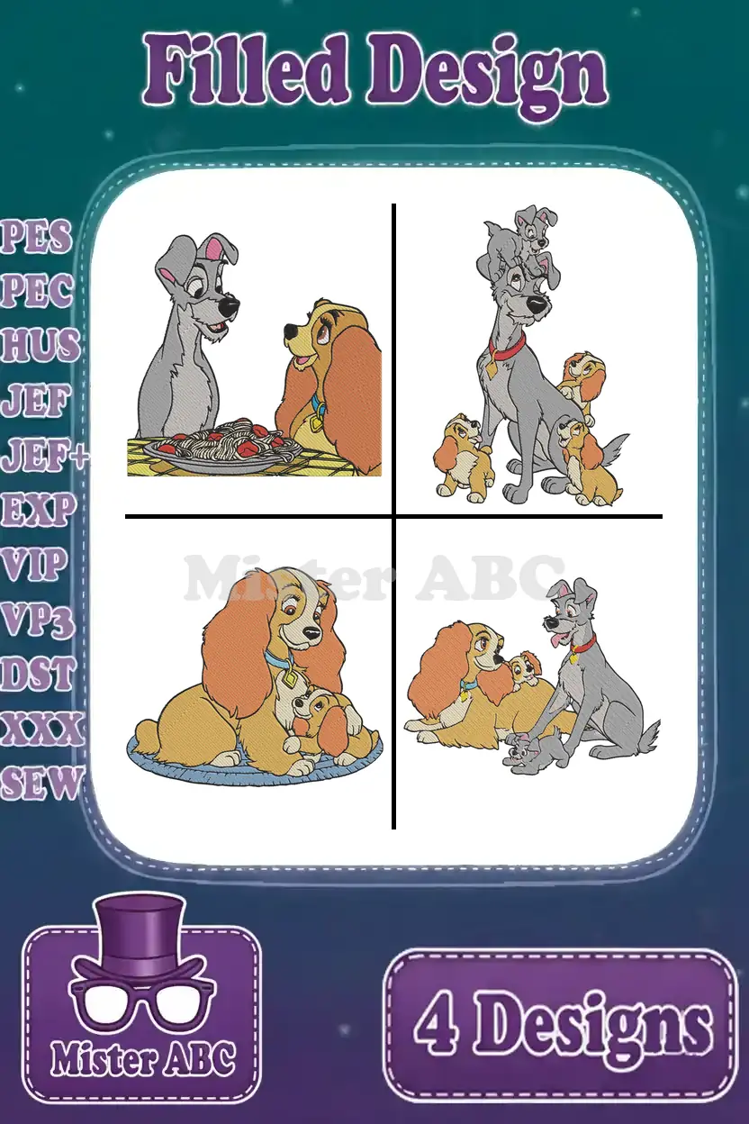 Lady And The Tramp – Lady Tramp And Scamp Puppy – Family Poses And Love – Disney Dogs – Filled Embroidery Design