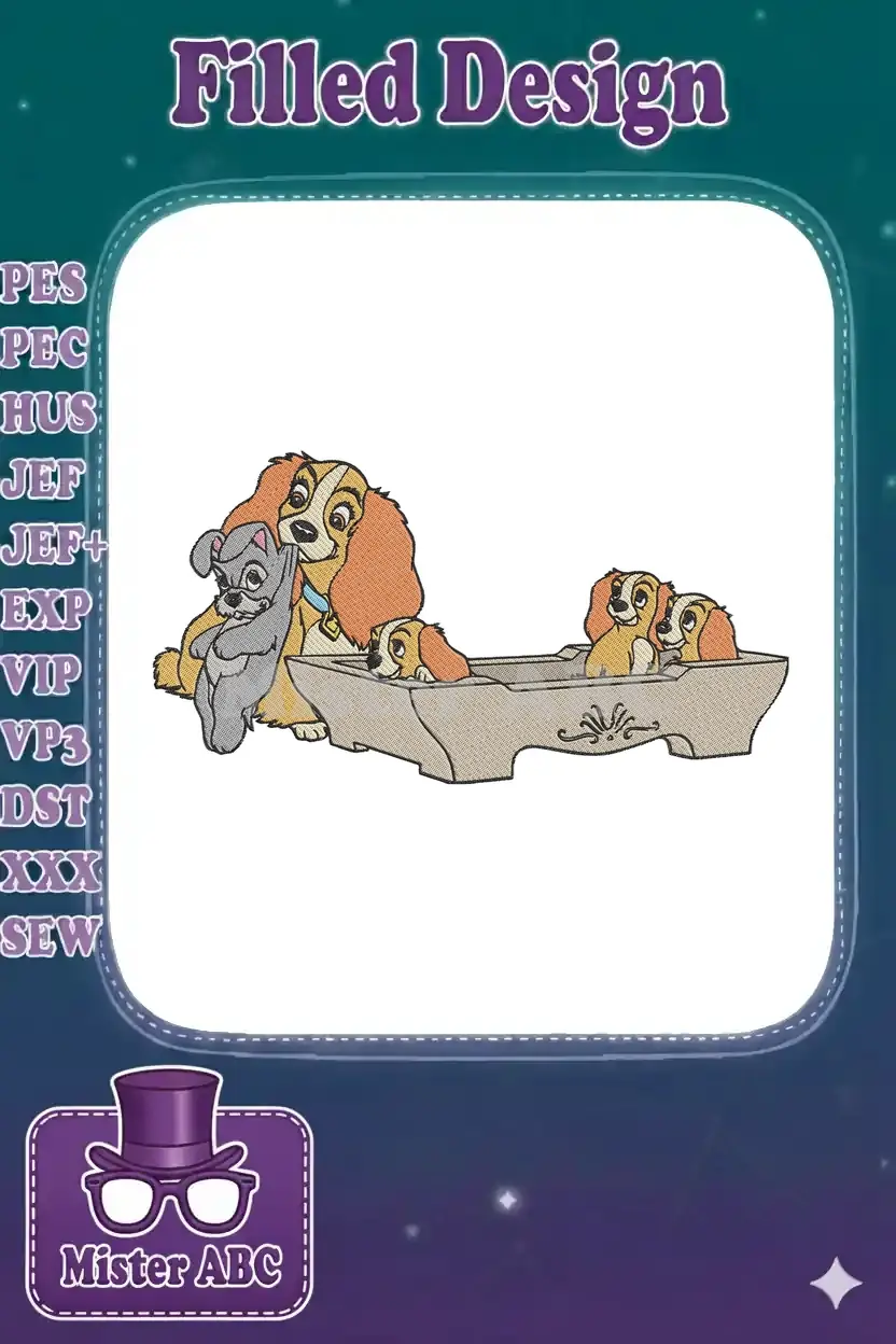 Lady Tramp and puppies in their dog bed embroidery designs