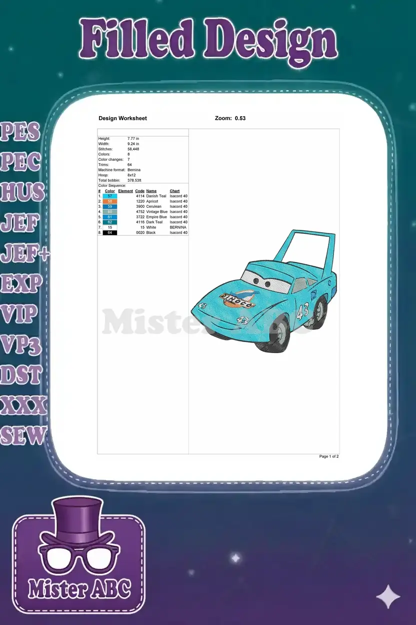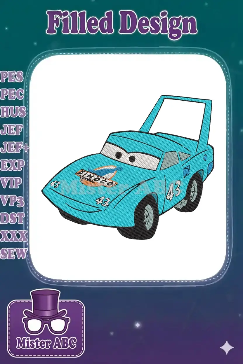 Light Blue Dinoco 43 Race Car Embroidery Designs