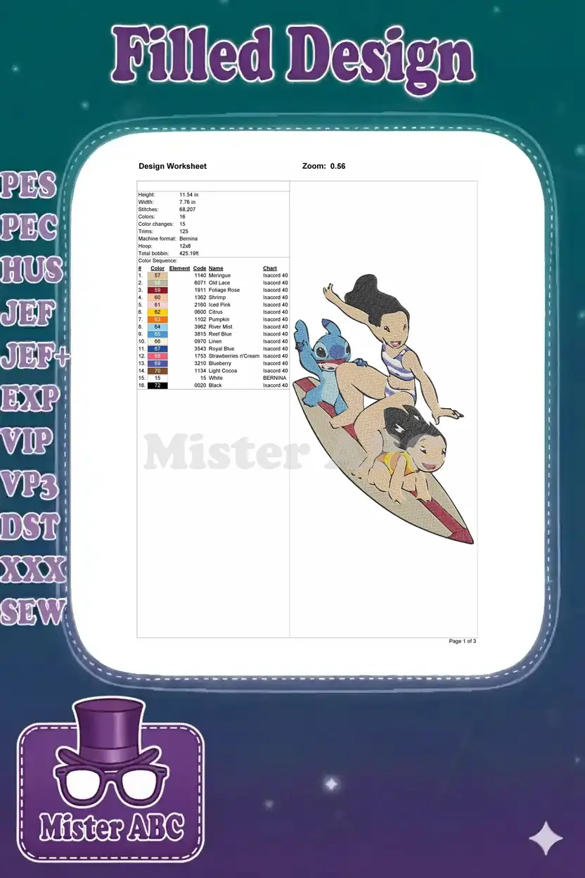 Catch a wave with Lilo, Stitch, and friends! This vibrant embroidery design captures a joyful surfing adventure, perfect for adding a touch of Disney magic.