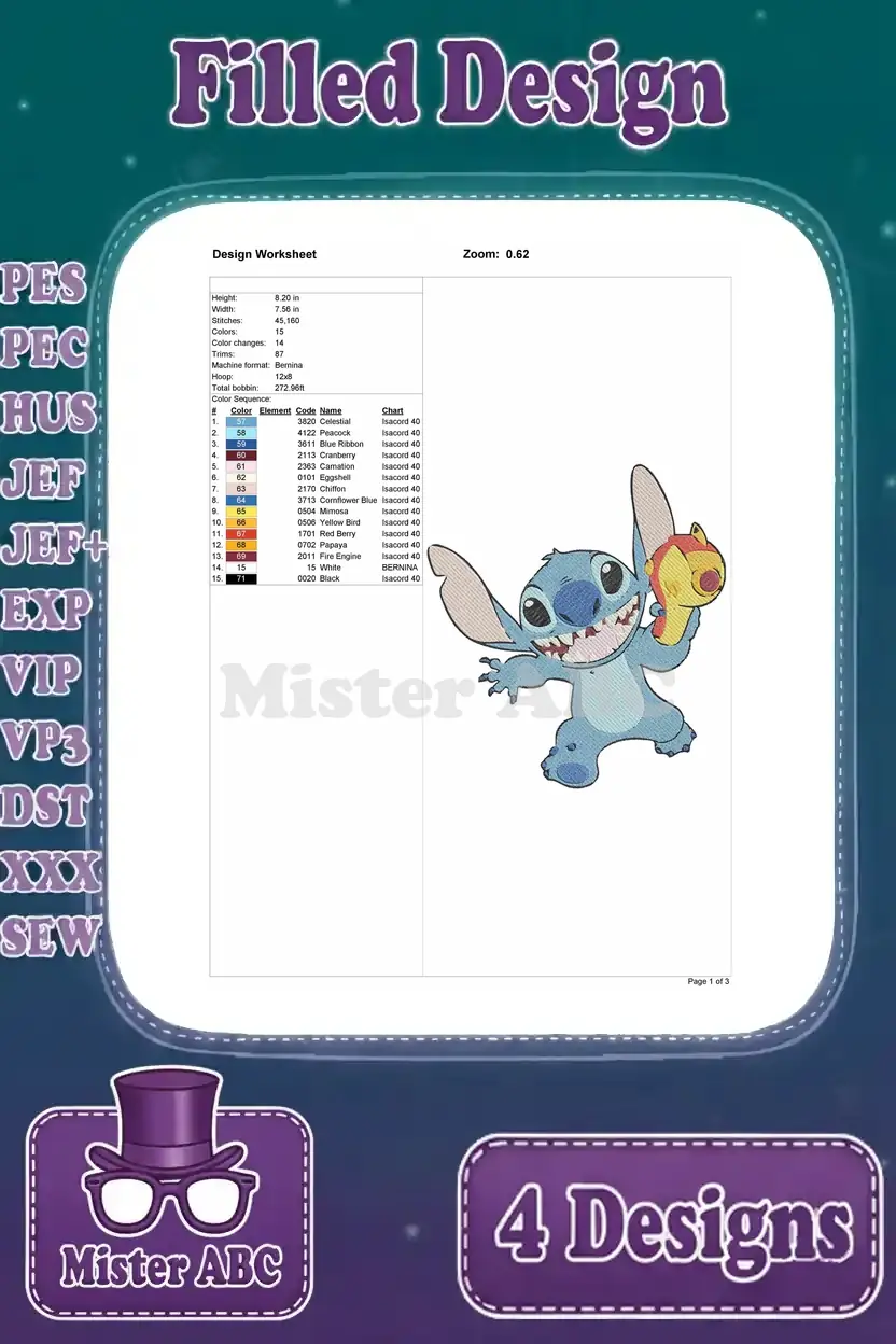 An incredible Lilo & Stitch experiment embroidery bundle featuring Stitch, Reuben, Experiment 627, and Sparky! Perfect for fans.
