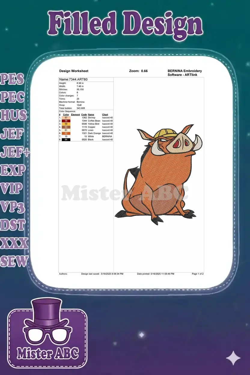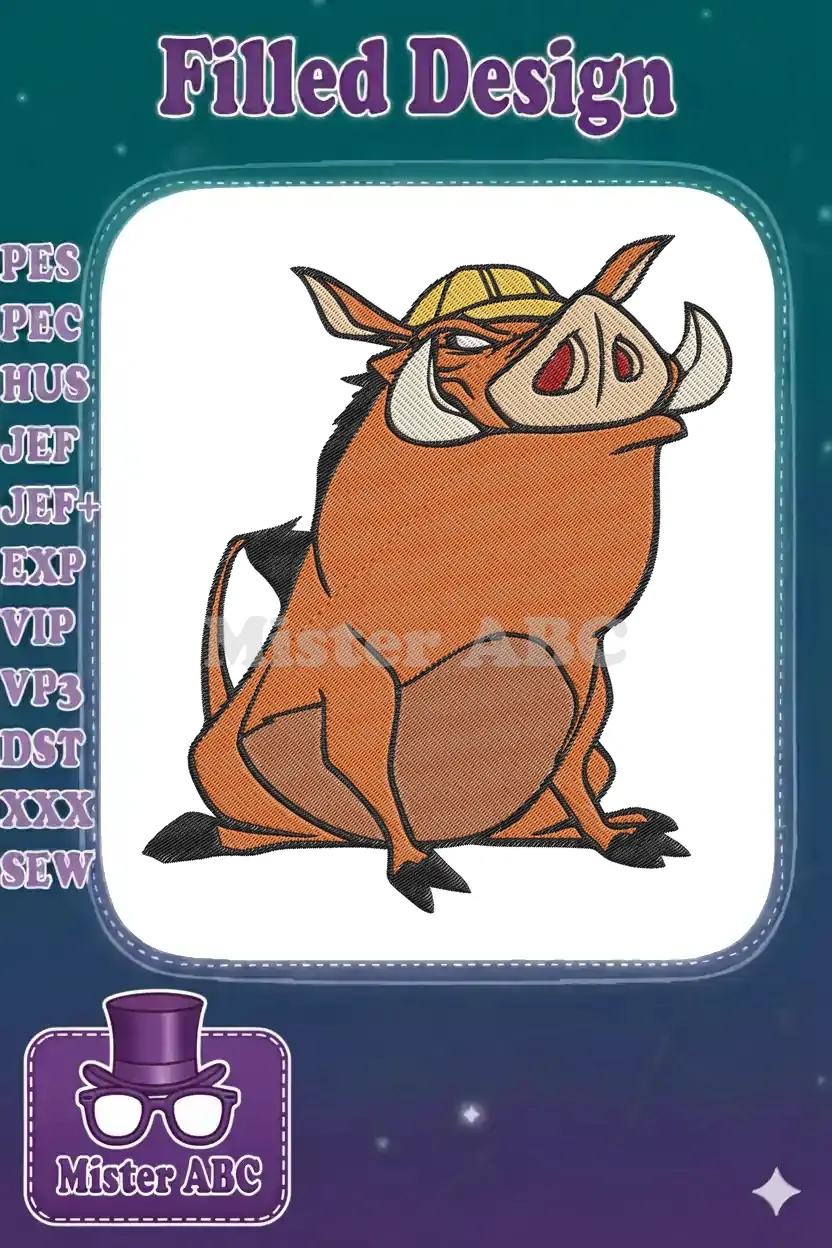 The Lion King Pumbaa warthog sitting wearing yellow hat embroidery designs