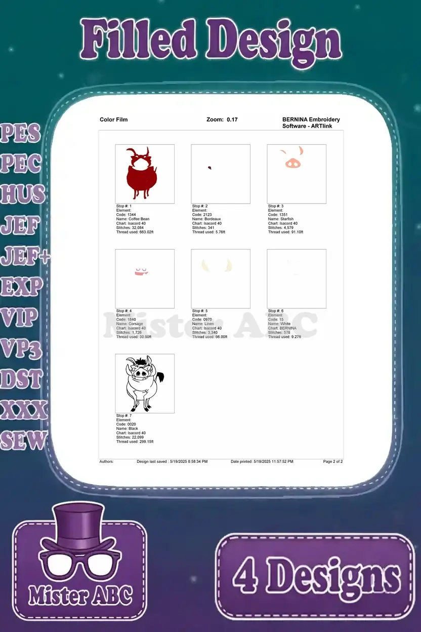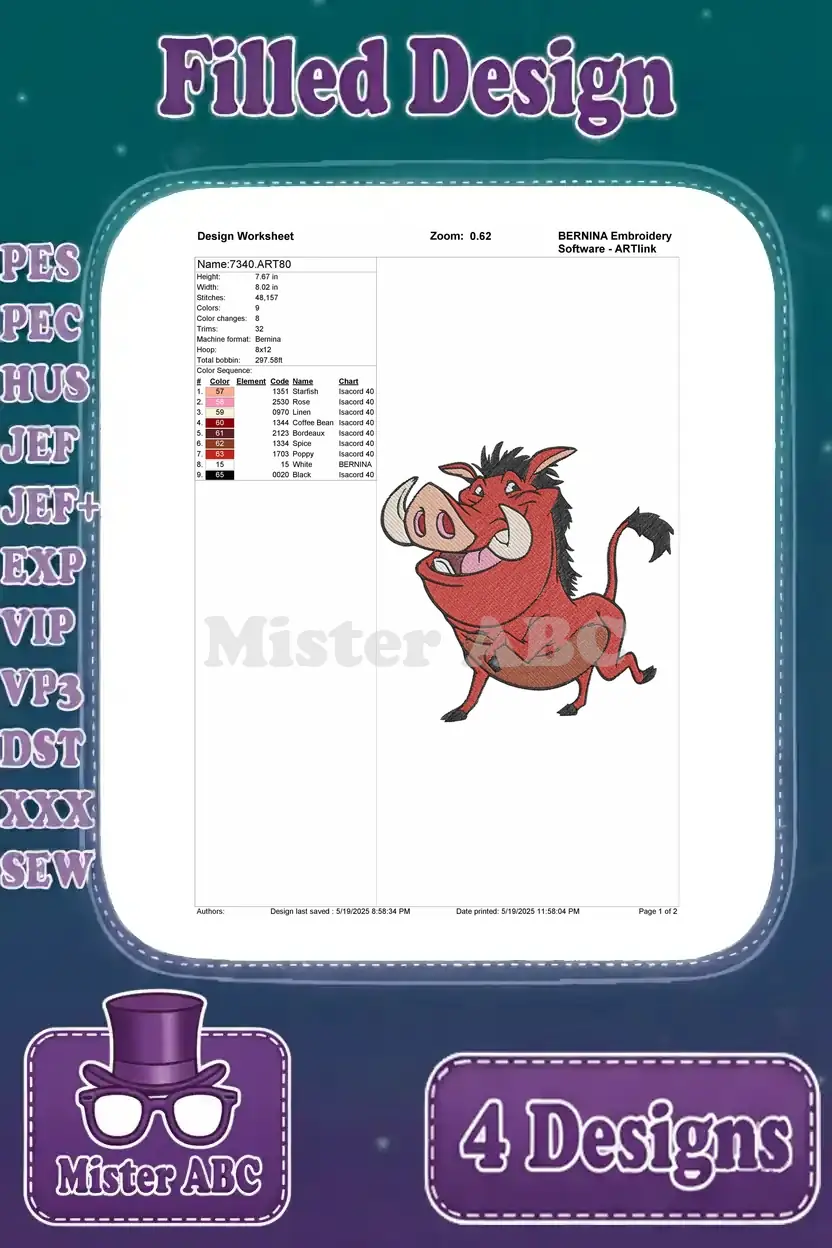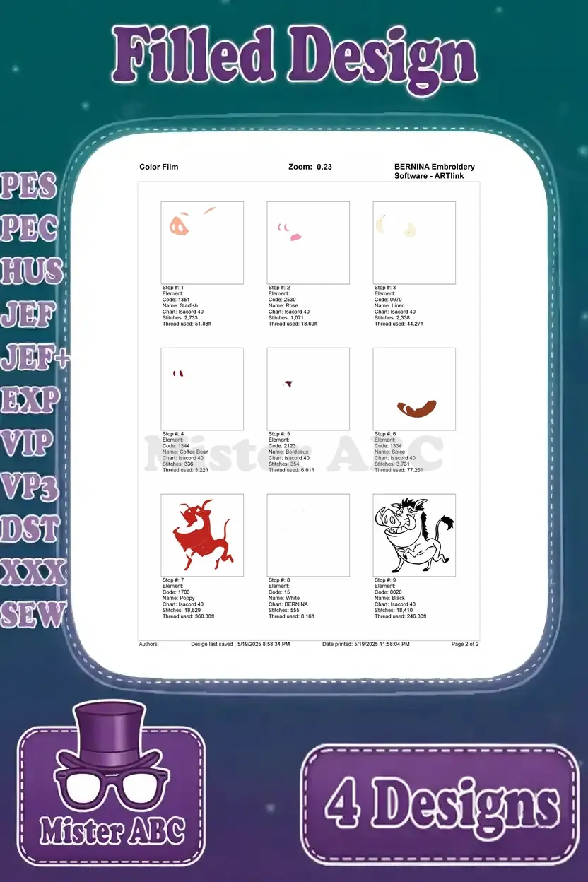 The Lion King Pumbaa Whog Various Poses Falling Standing Thoughtful Running – Filled Embroidery Design