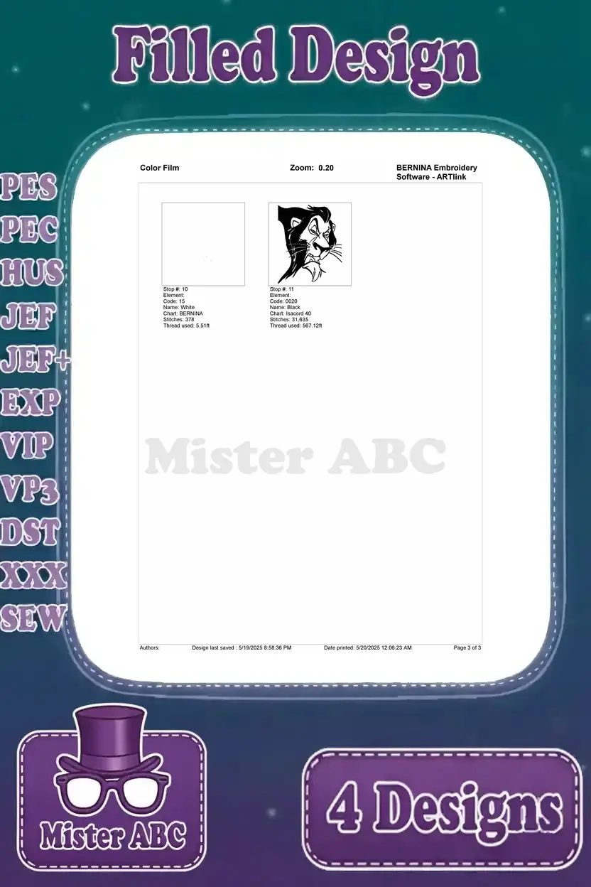 Unleash the villainous charm of Scar with this 4-design embroidery bundle! Perfect for fans of the iconic antagonist.