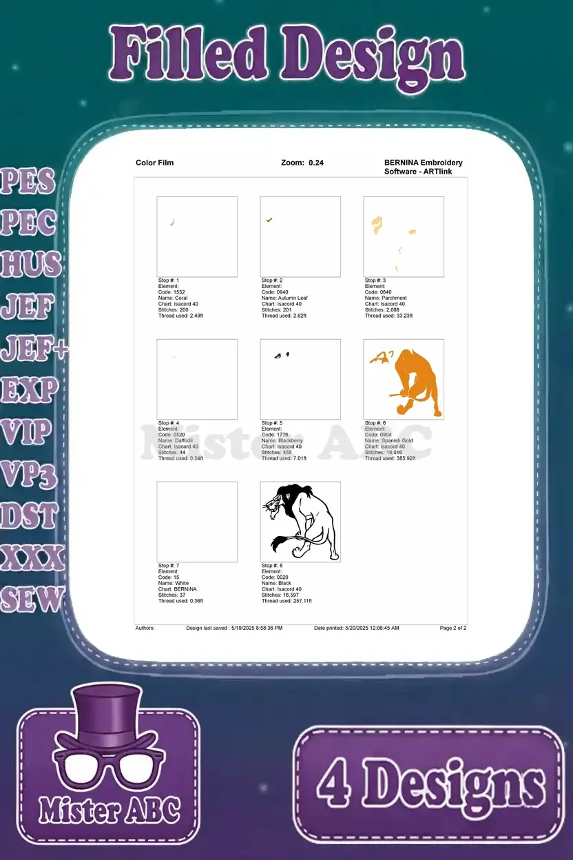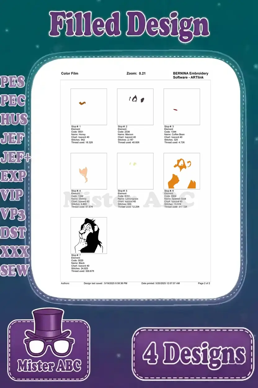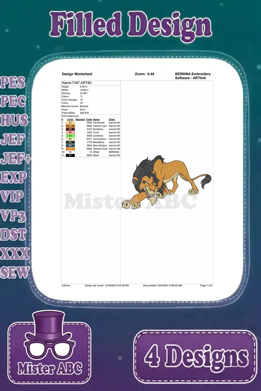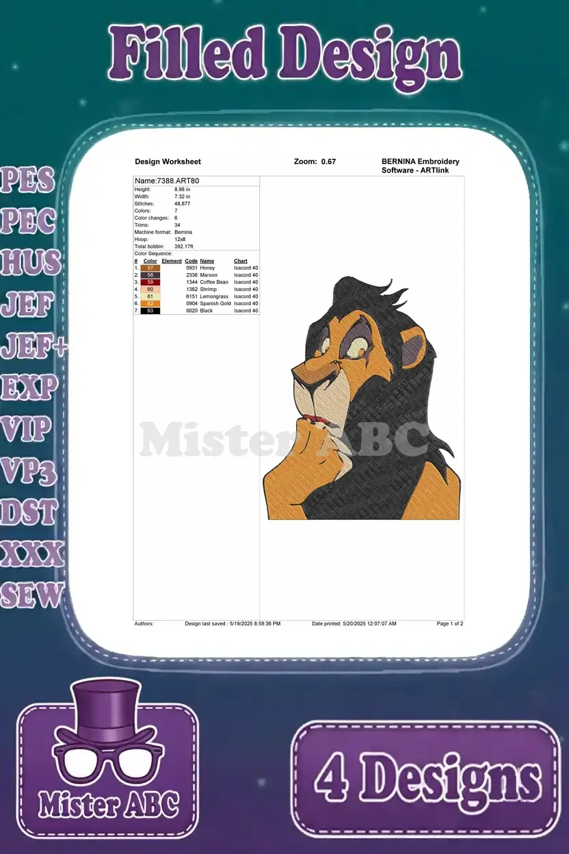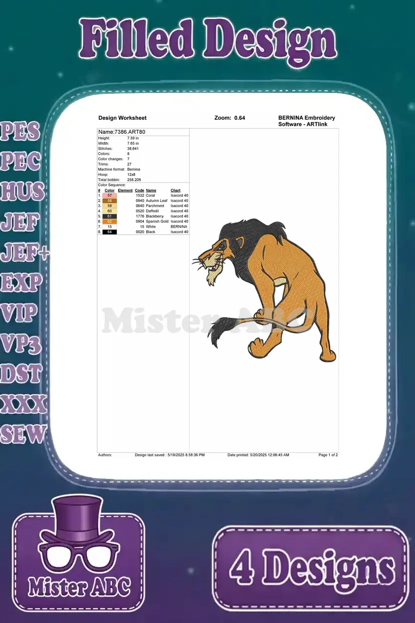The Lion King Scar Villainous Lion Prowling Posing And Expressive Portraits – Filled Embroidery Design