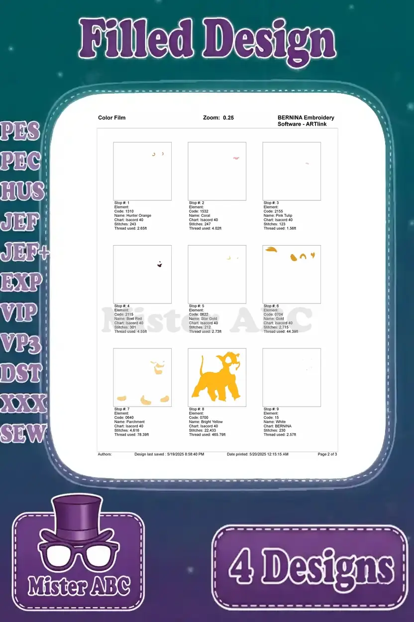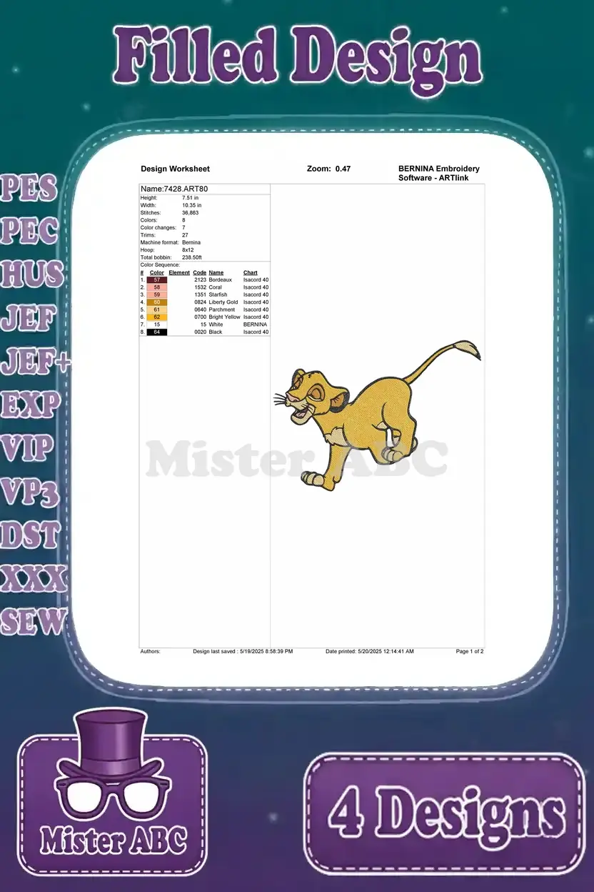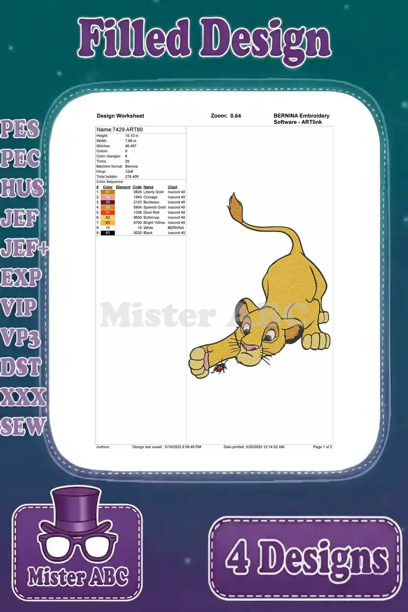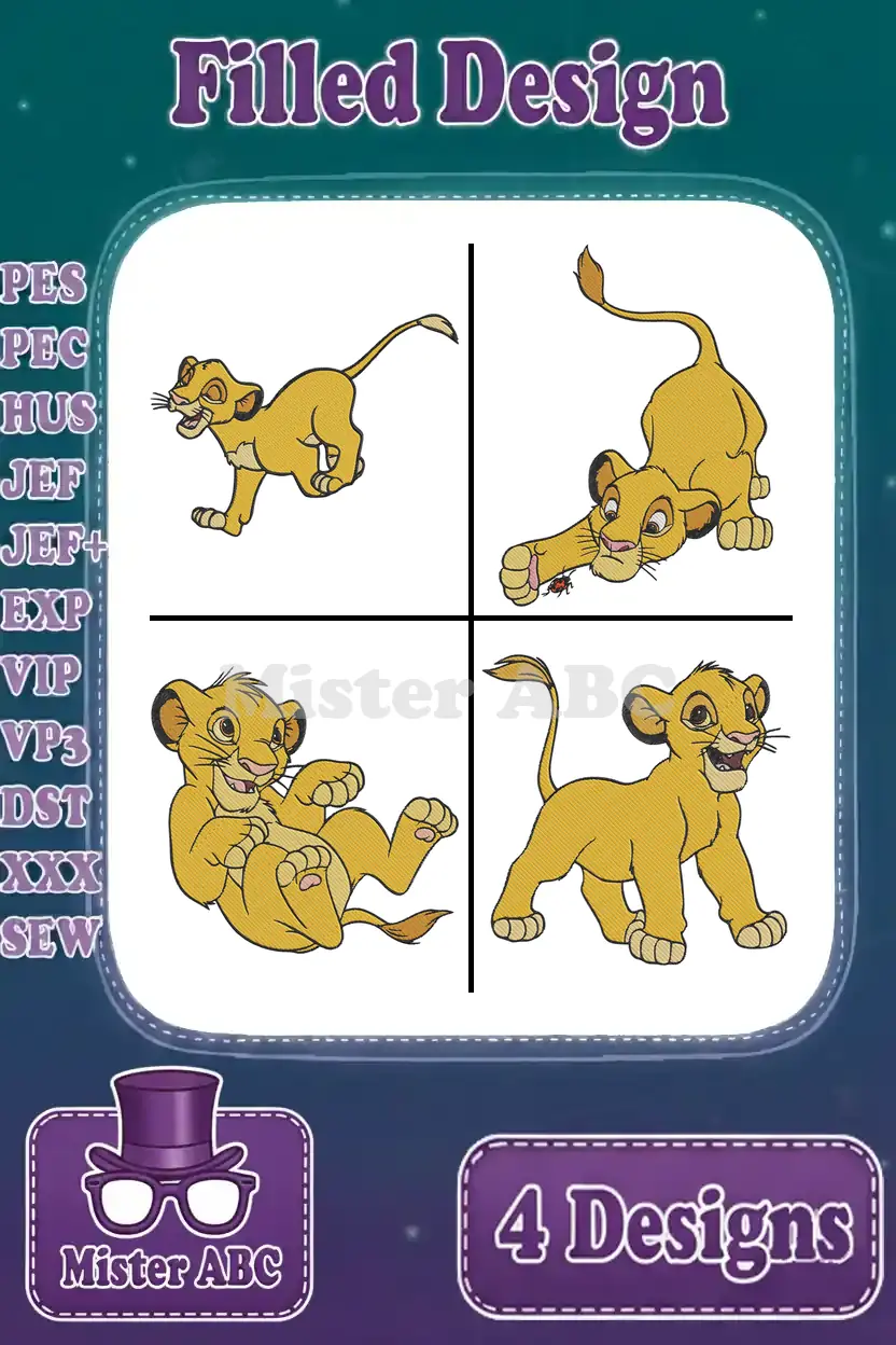 A delightful bundle of four filled embroidery designs featuring young Simba in various playful poses. Perfect for fans!