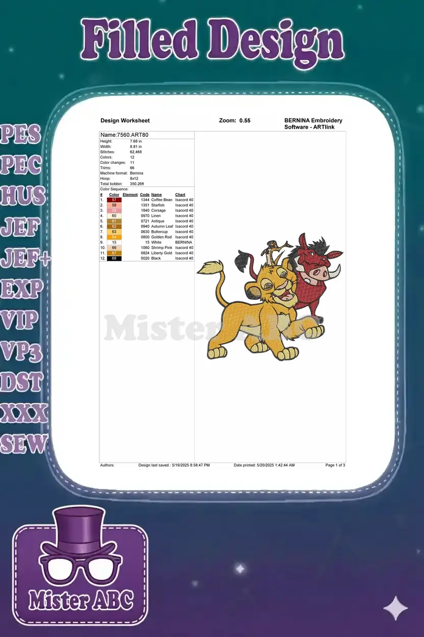 Lion King Simba Timon Pumbaa friends cartoon embroidery designs