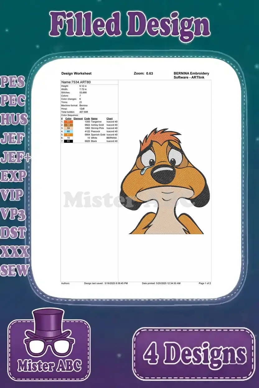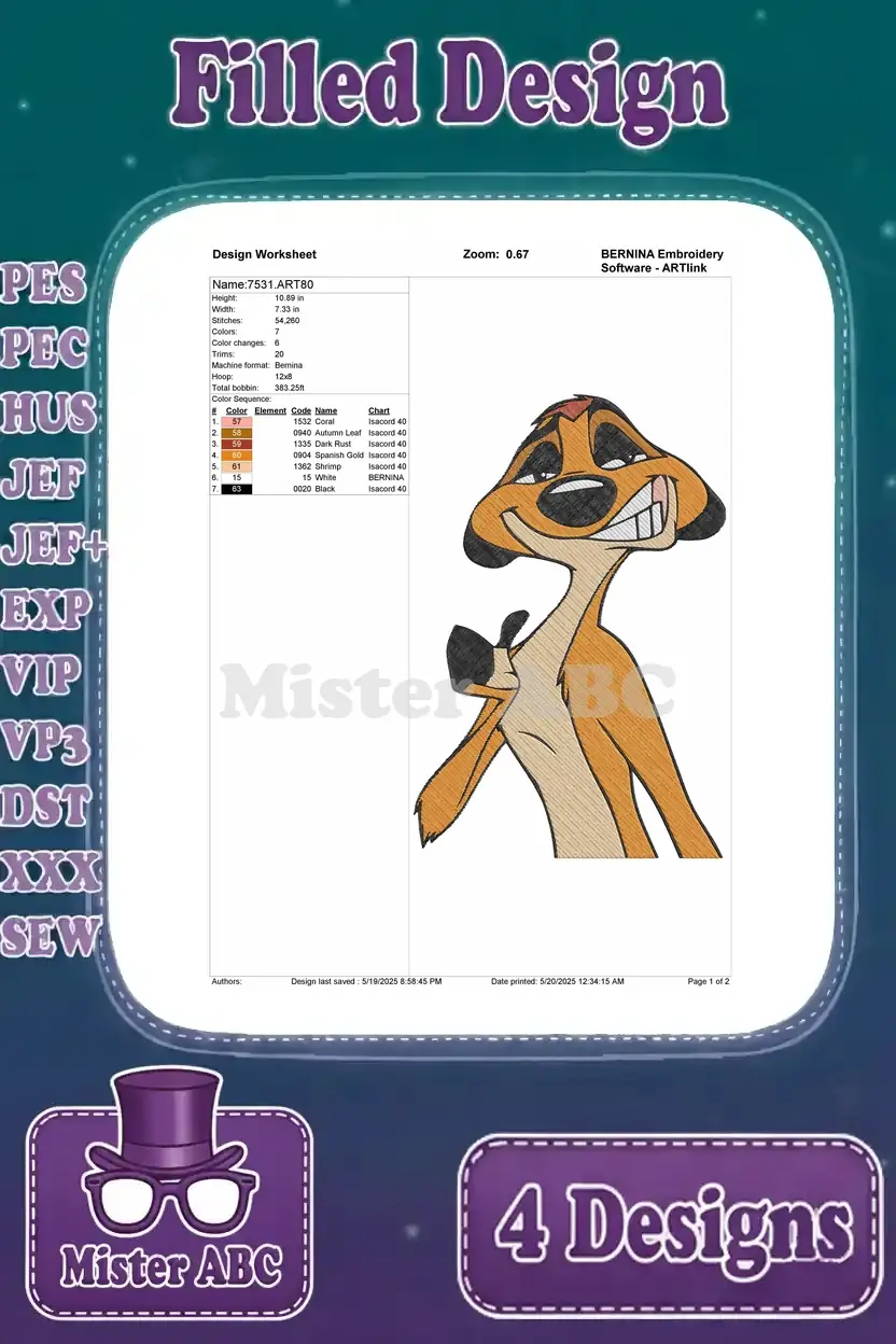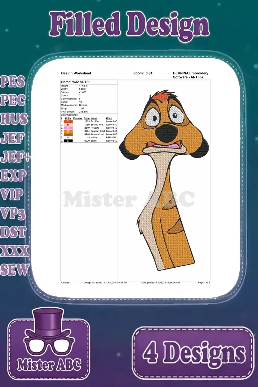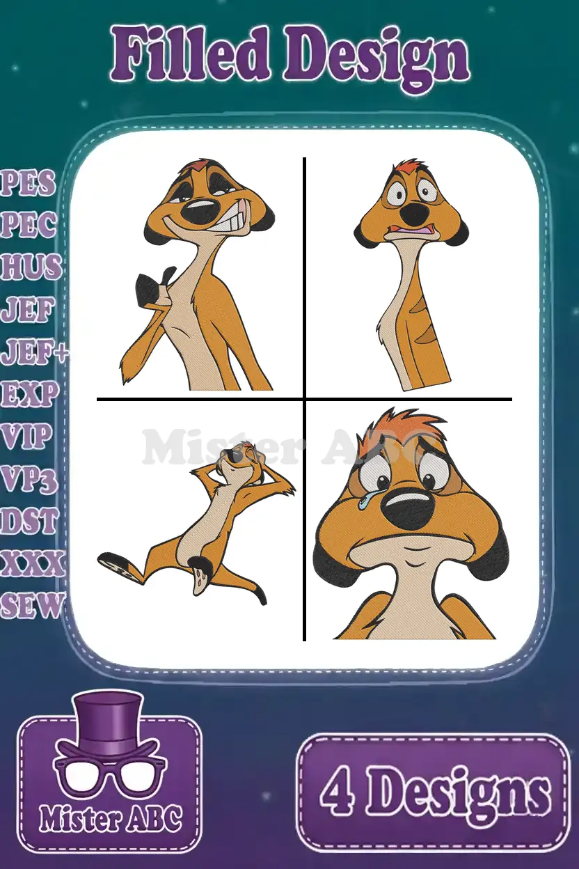 The Lion King – Timon The Meerkat Pal – Expressive Face Close Up And Lying Down Poses – Disney Animal Sidekick – Filled Embroidery Design