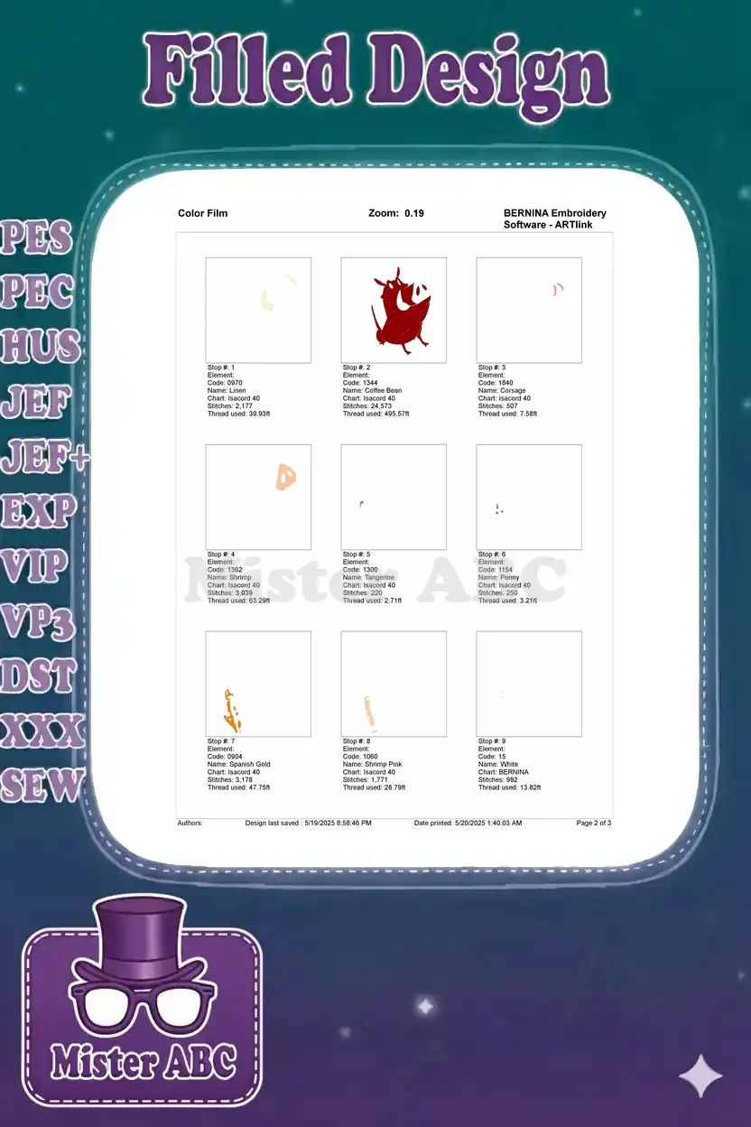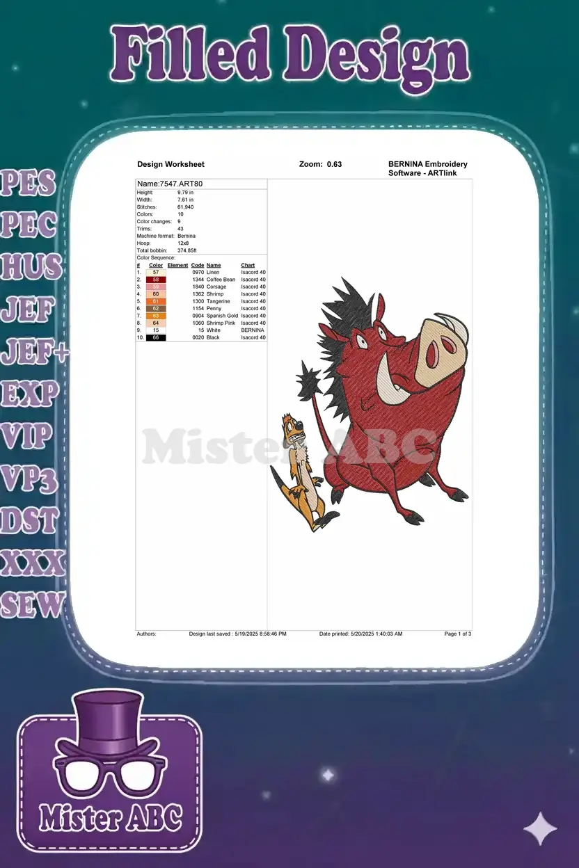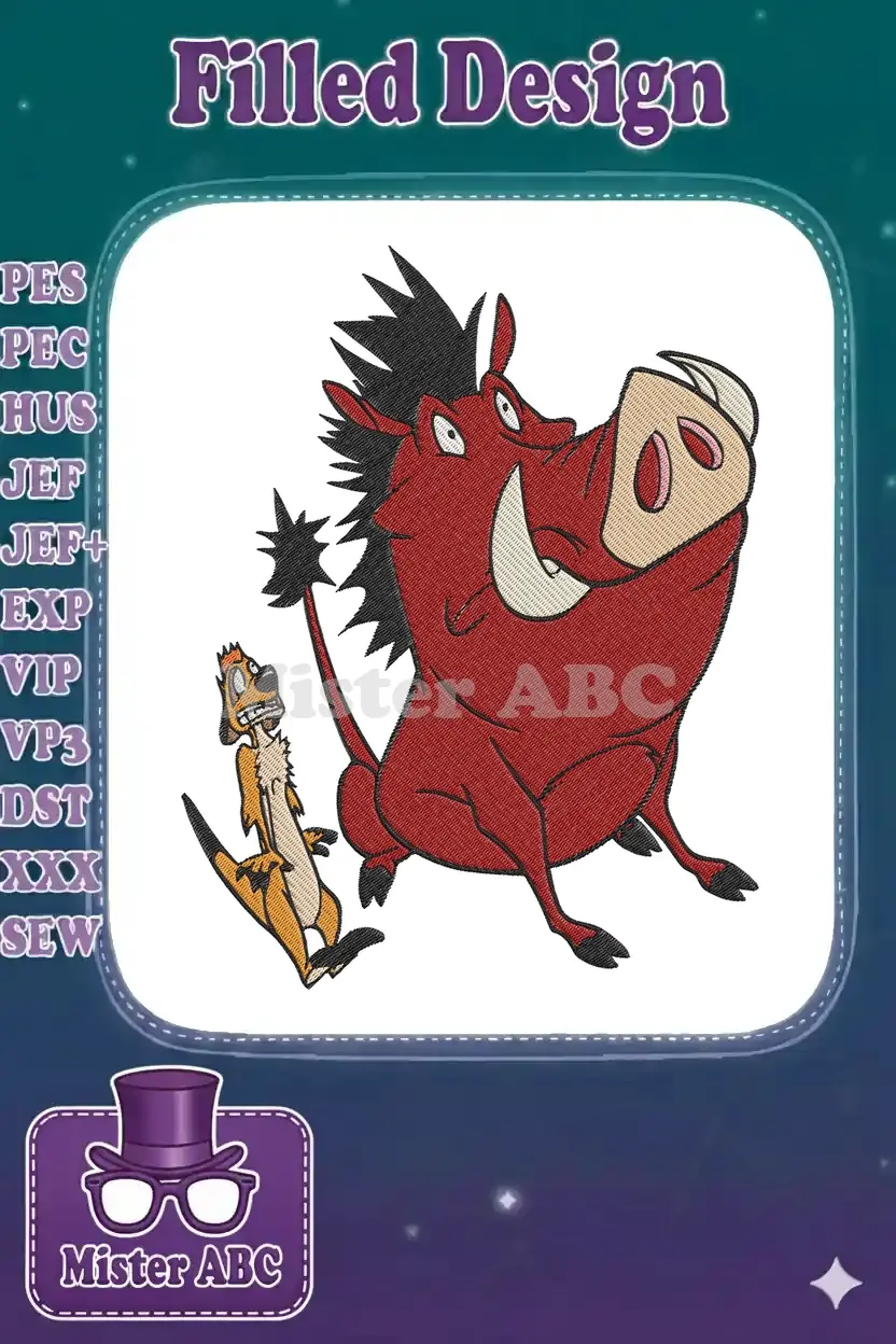 Celebrate friendship with this vibrant embroidery of Pumbaa and Timon. A detailed design, perfect for Disney fans.