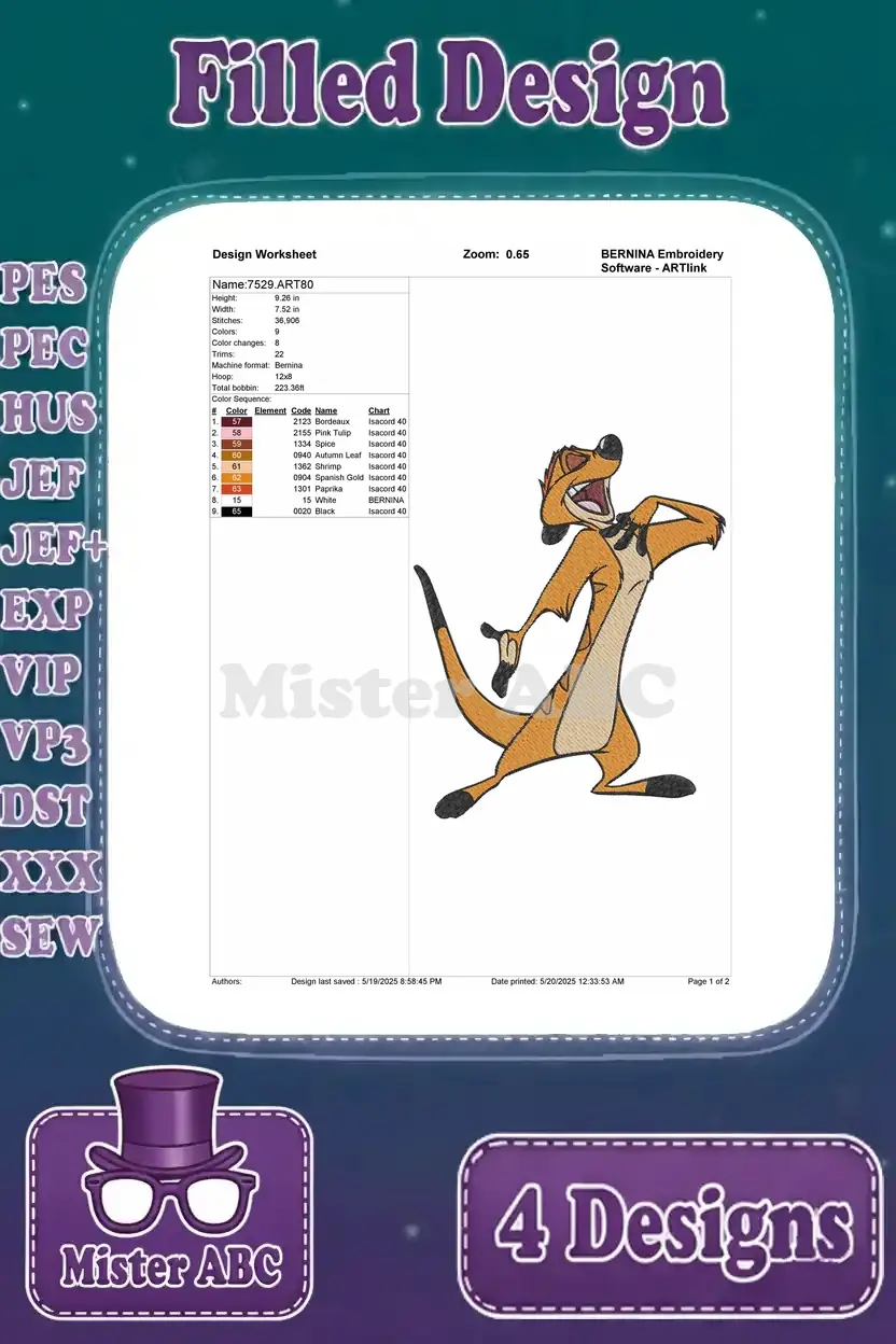 The Lion King – Timon The Witty Meerkat – Hakuna Matata Trio Member – Multiple Standing Poses – Character – Filled Embroidery Design