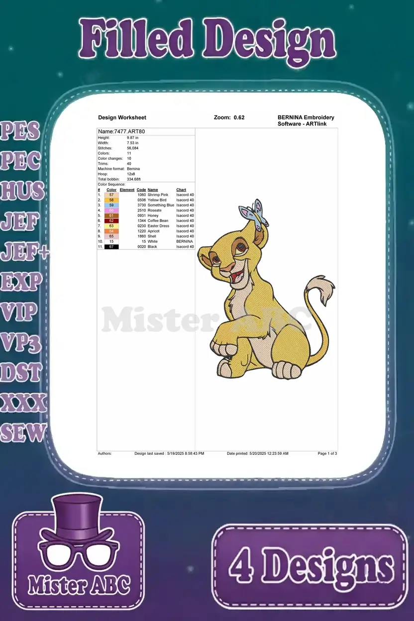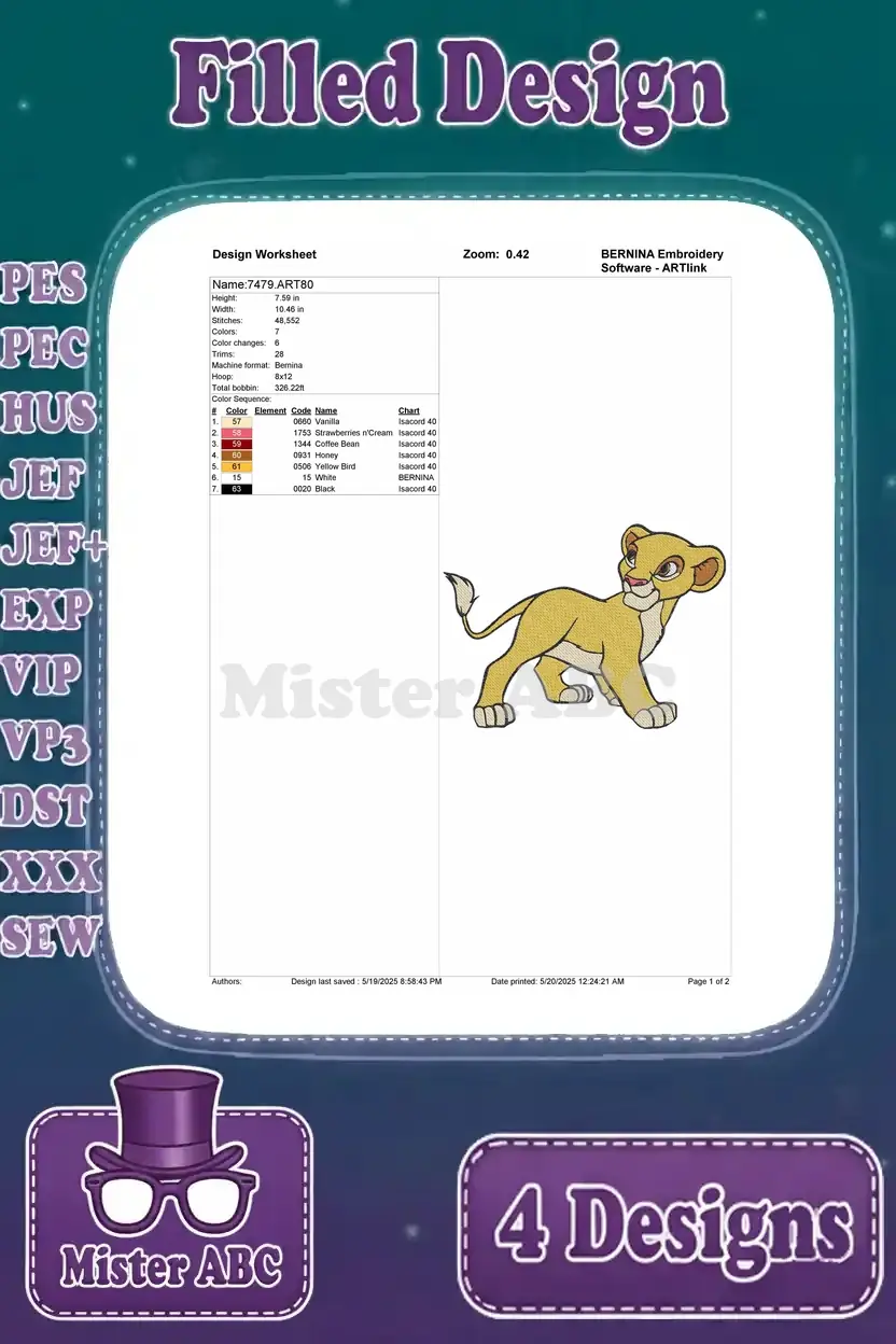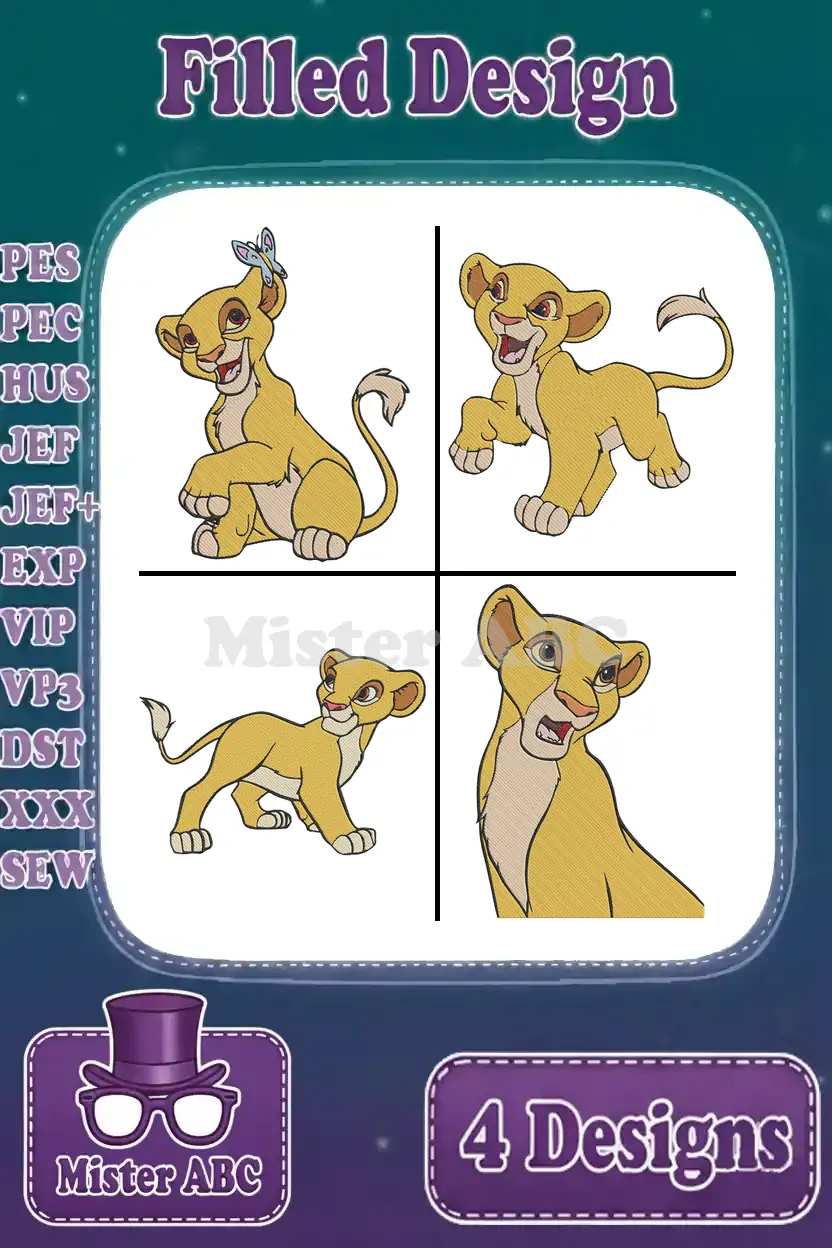 Unleash the wild with this adorable 4-design filled embroidery bundle featuring young Simba’s playful poses, perfect for fans.