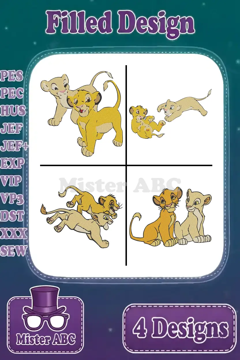 The Lion King – Young Simba And Nala Lion Cubs Playing Together – Adorable Best Friends Adventure Poses – Filled Embroidery Design