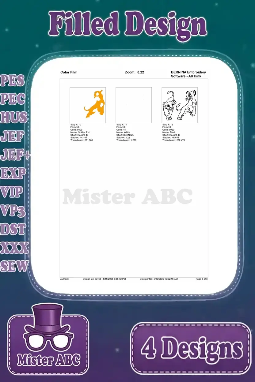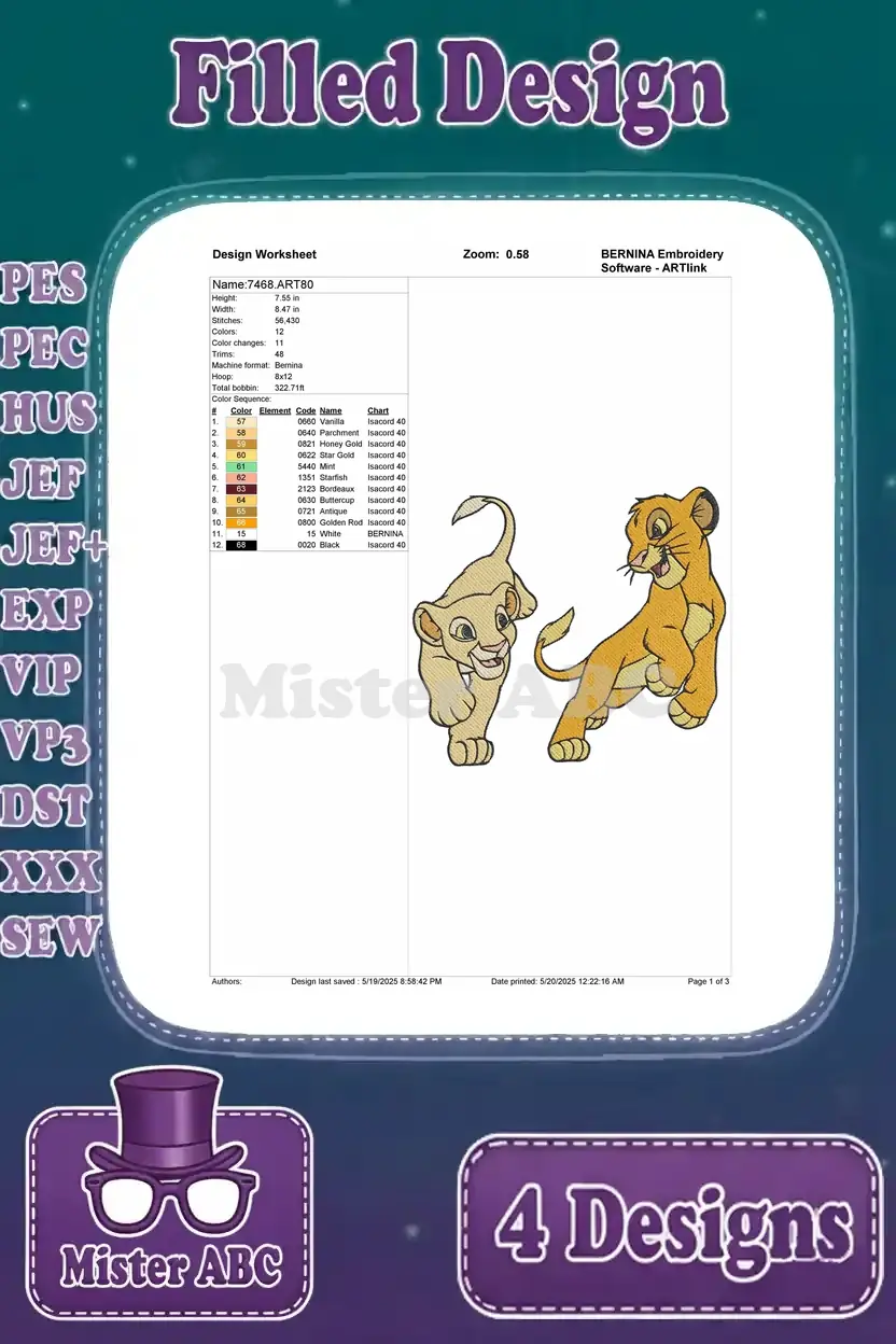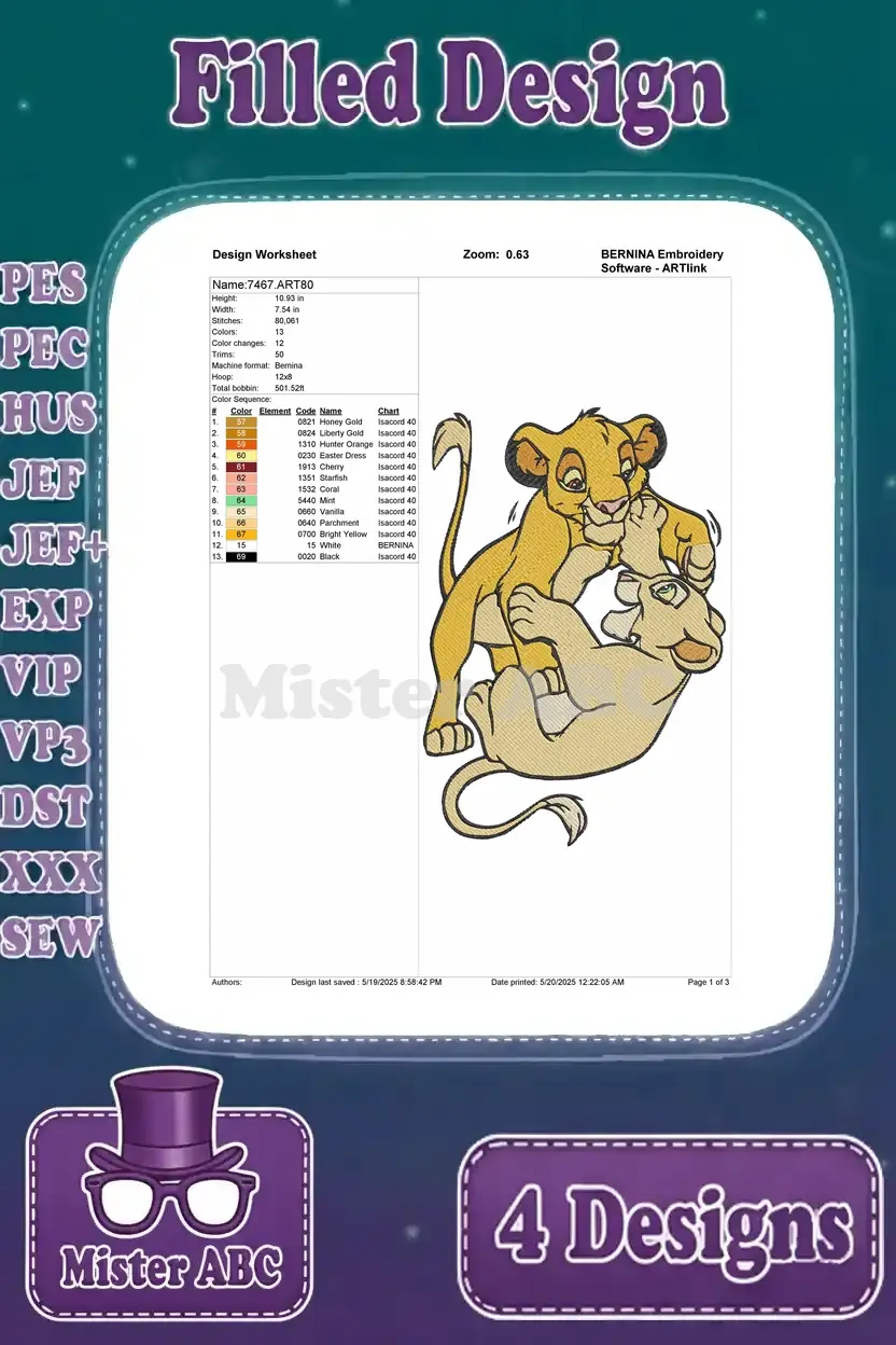 The Lion King – Young Simba And Nala Playful Lion Cub Interactions – Best Friends Tumbling And Pouncing – Filled Embroidery Design