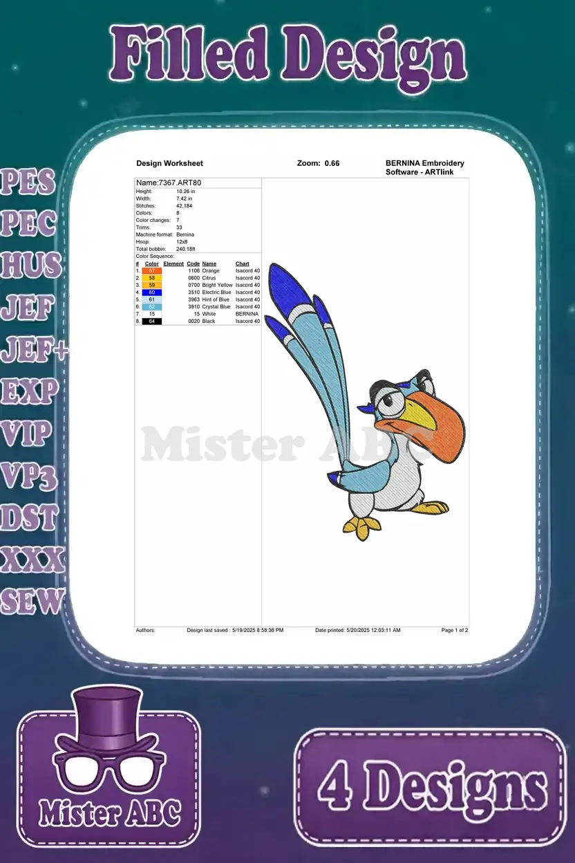 The Lion King Zazu Red Billed Hornbill Various Flying And Perched Character Poses – Filled Embroidery Design