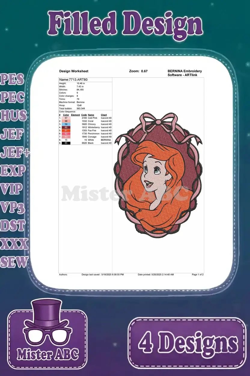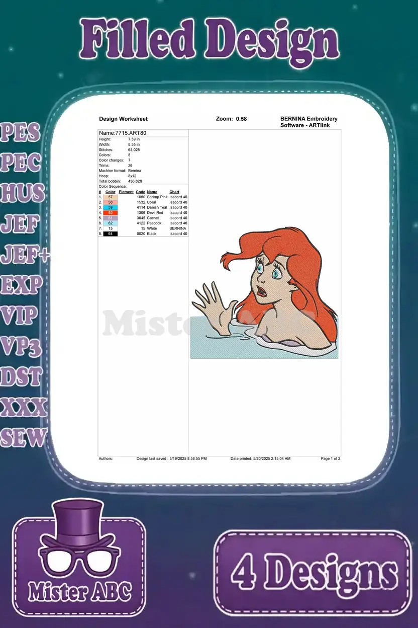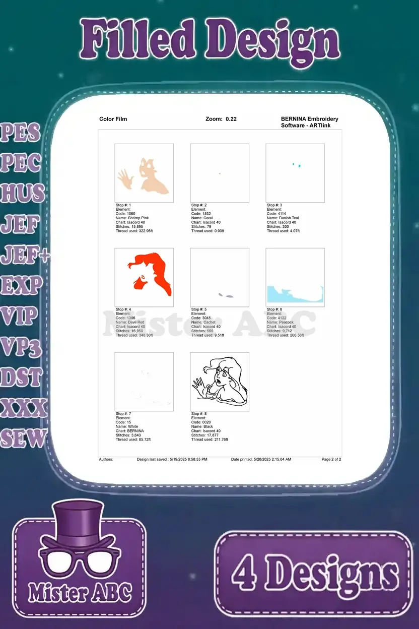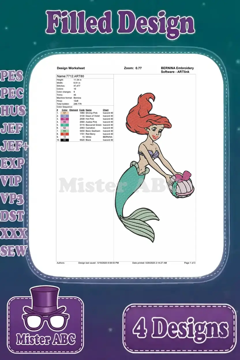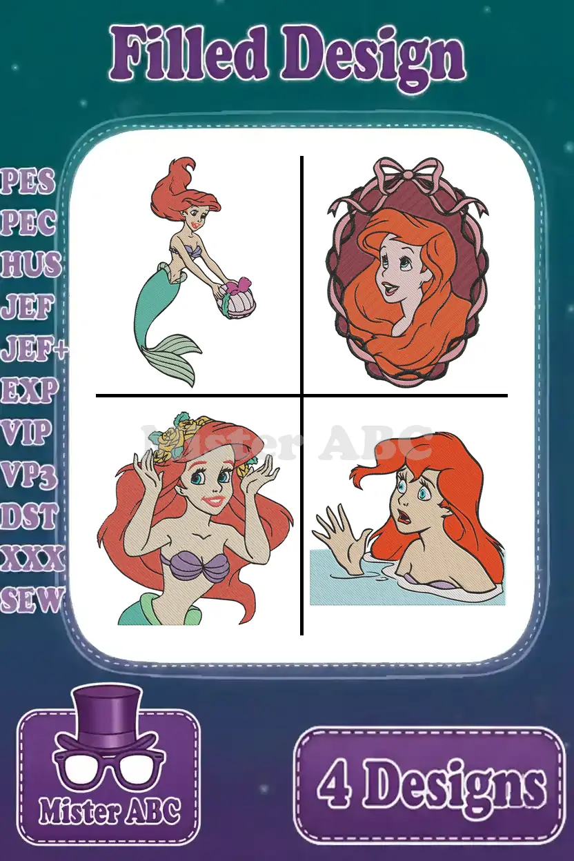 Dive into enchantment with this delightful Ariel embroidery design bundle, featuring four unique filled designs perfect for any Disney fan!