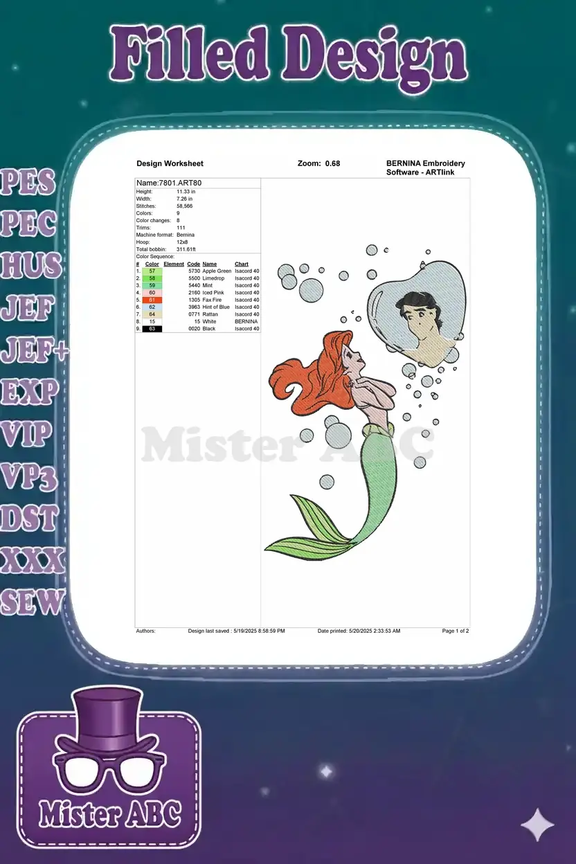 Little Mermaid Ariel dreaming of Prince Eric bubbles embroidery designs