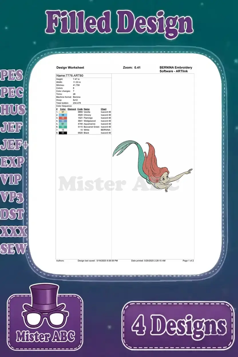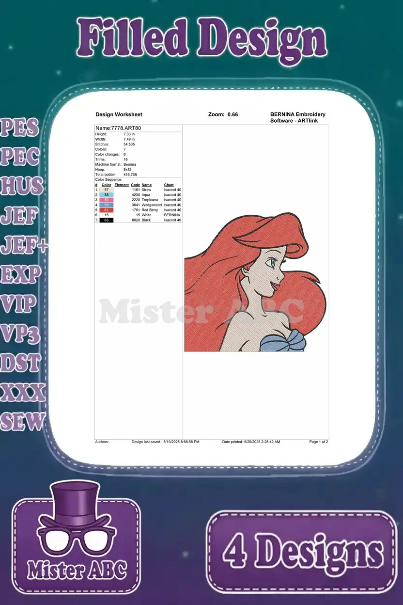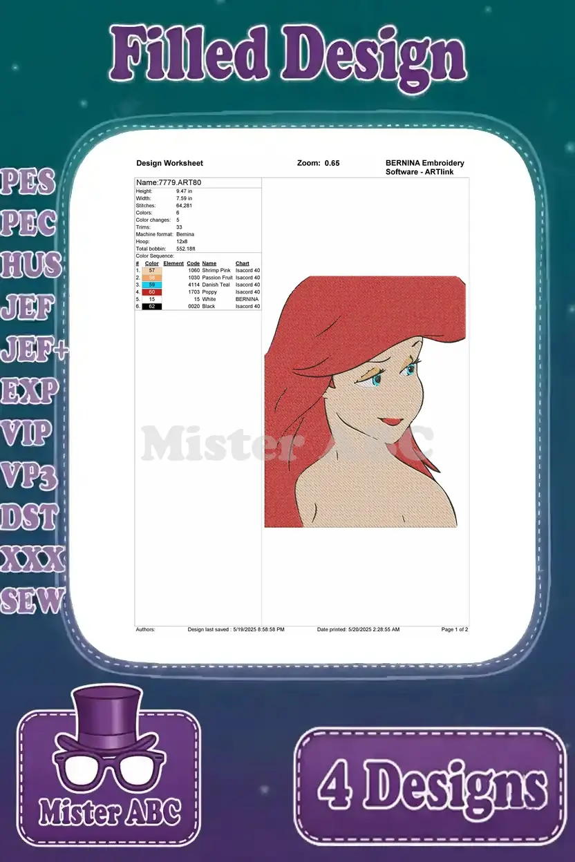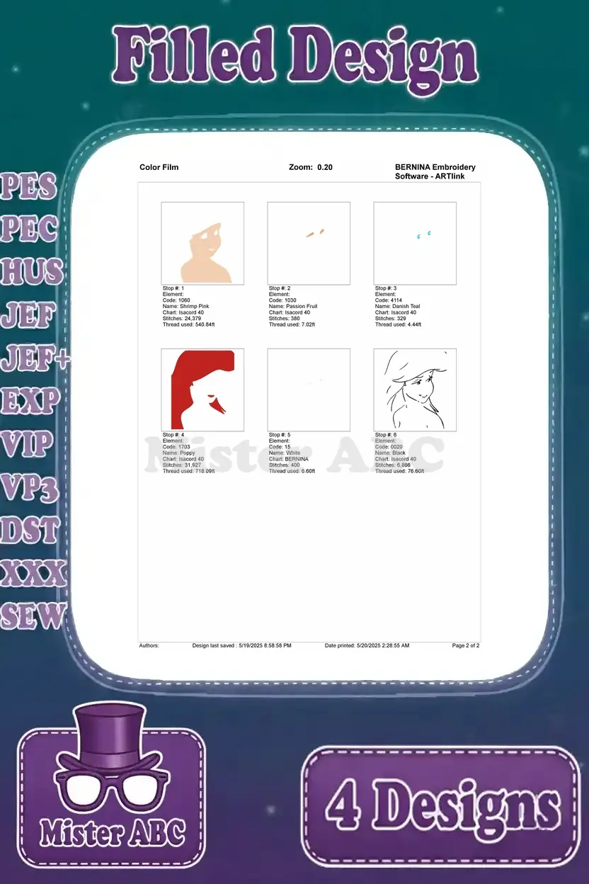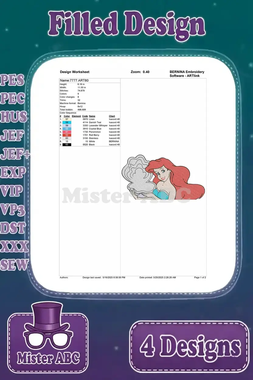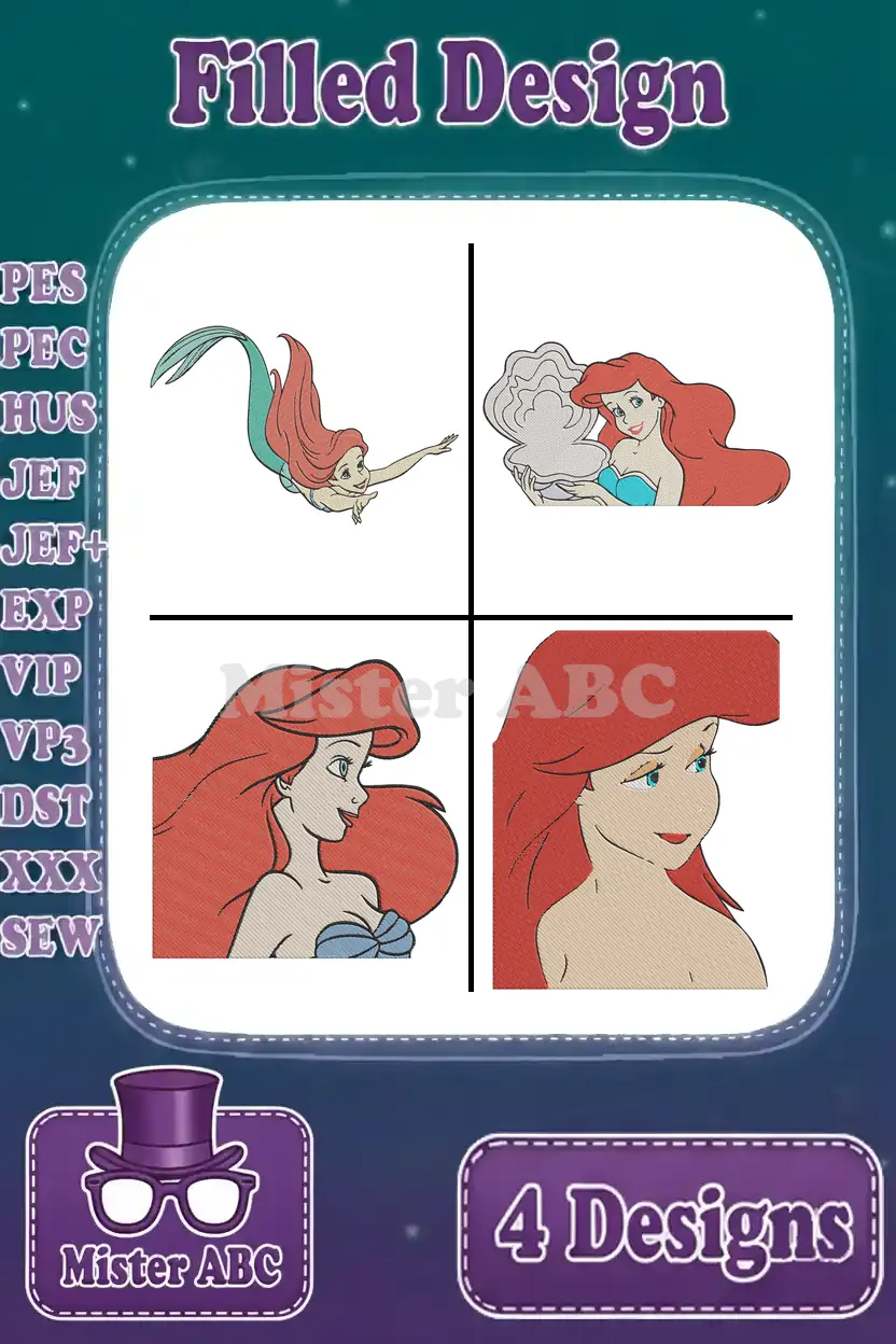 The Little Mermaid Ariel Floating With Seashell And Various Beautiful Portraits – Filled Embroidery Design