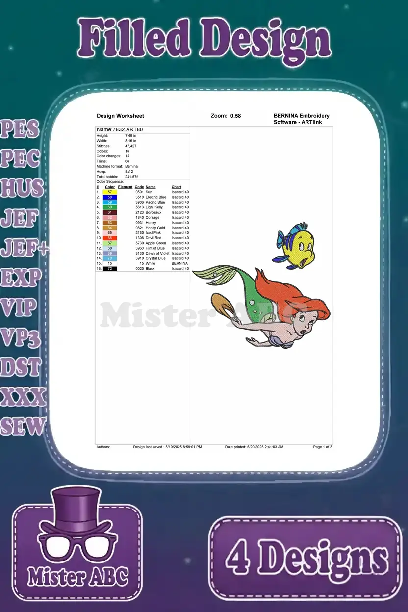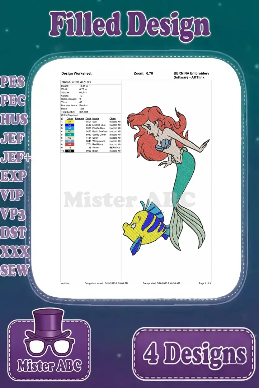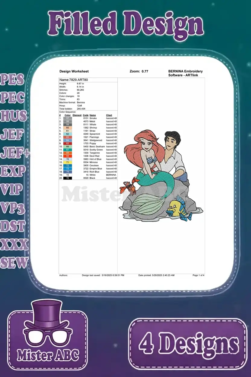 The Little Mermaid – Ariel Flounder Sebastian And Prince Eric – Undersea And Land Love – Disney Characters – Filled Embroidery Design