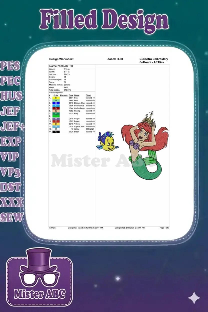 Little Mermaid Ariel and Flounder cartoon character embroidery designs