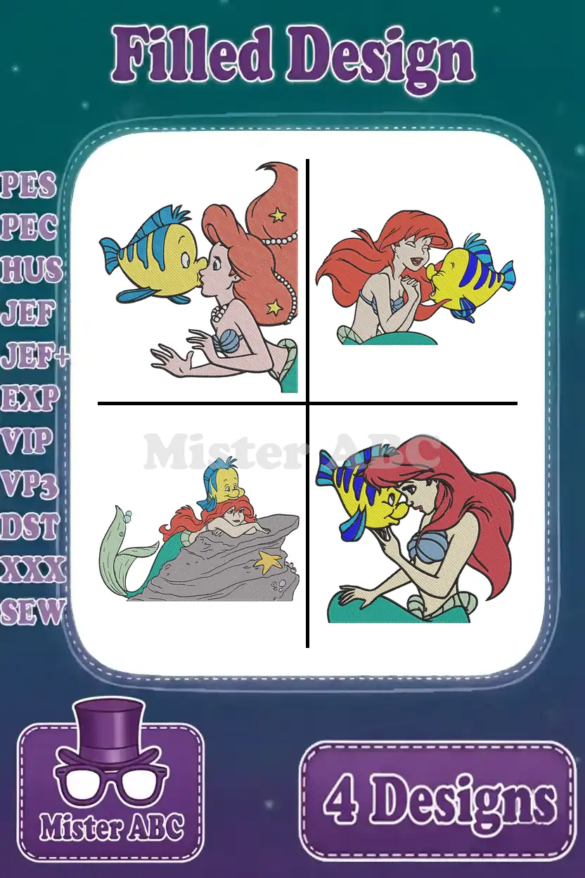 The Little Mermaid – Ariel With Flounder And Sebastian – Close Up Underwater Friends – Disney Character – Filled Embroidery Design