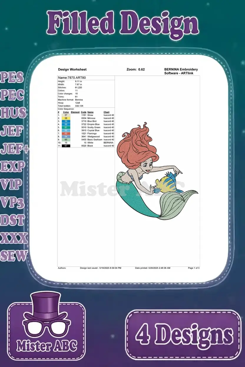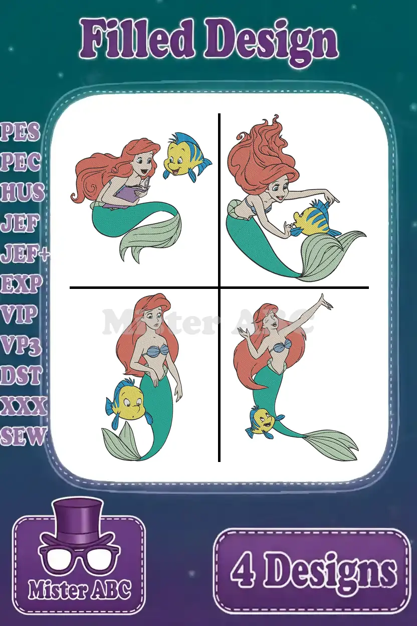 The Little Mermaid – Ariel The Little Mermaid And Best Pal Flounder – Charming Under The Sea Poses – Filled Embroidery Design
