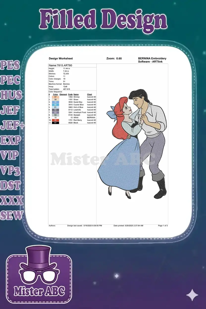 Celebrate love with Ariel and Prince Eric in this enchanting embroidery design, perfect for adding a magical touch to any project.