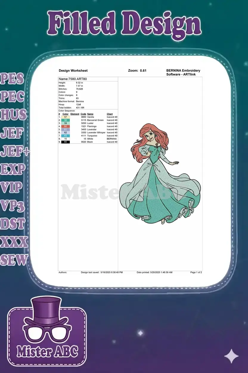 Little Mermaid Ariel Princess in Green Dress embroidery designs
