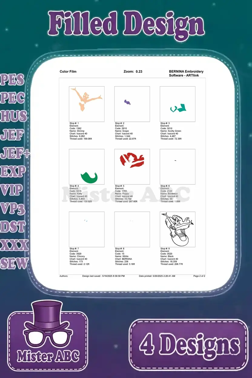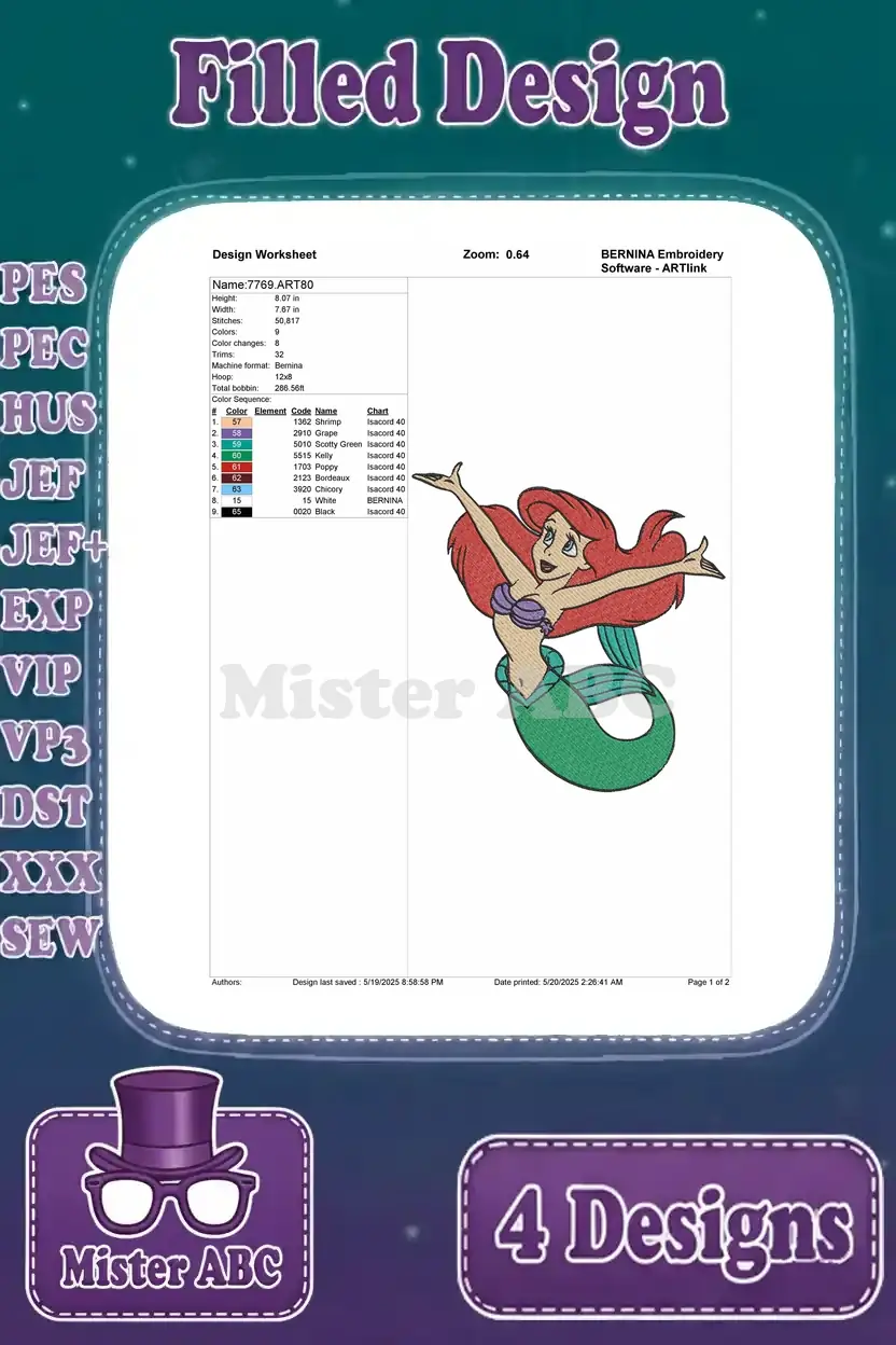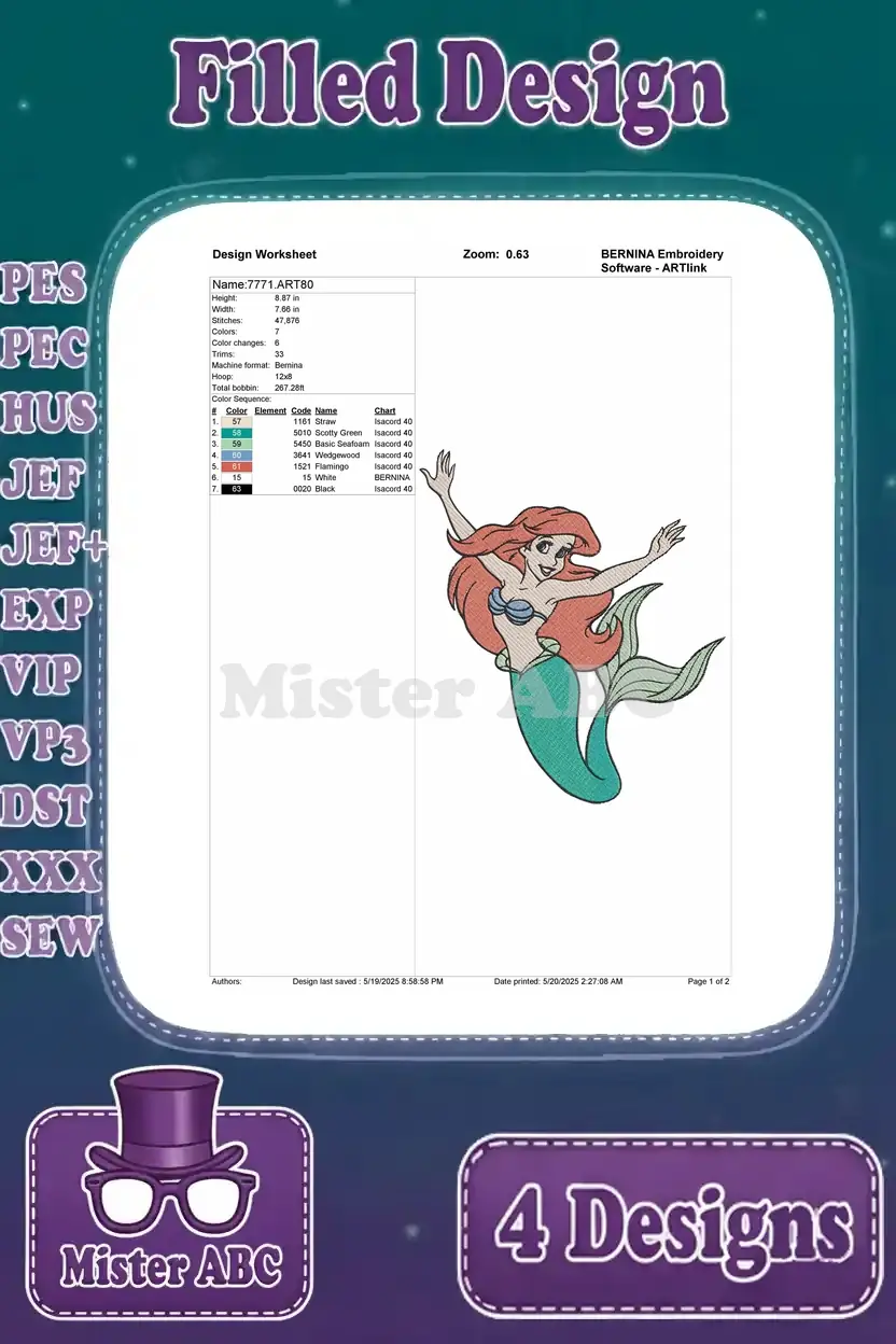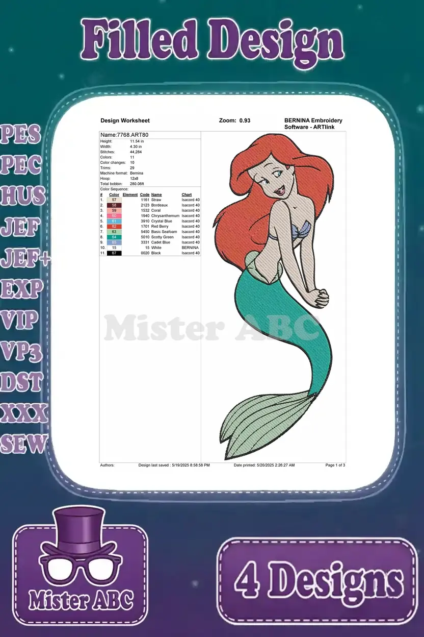 Dive into enchanting aquatic embroidery with this bundle of four vibrant Ariel designs. Perfect for fans of the beloved mermaid princess!