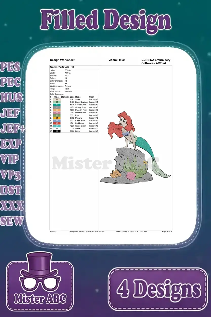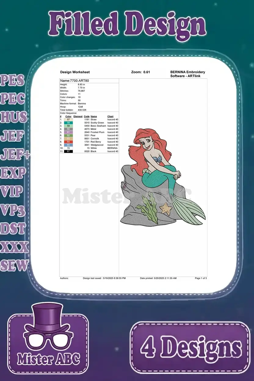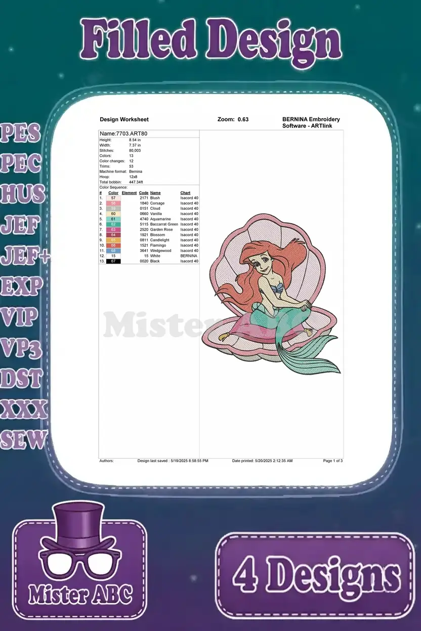 The Little Mermaid Ariel On Rock In Pink Dress And In Giant Seashell Posing – Filled Embroidery Design