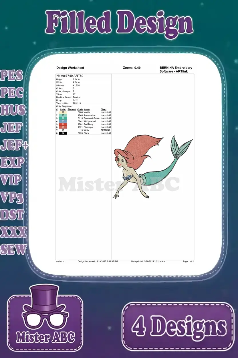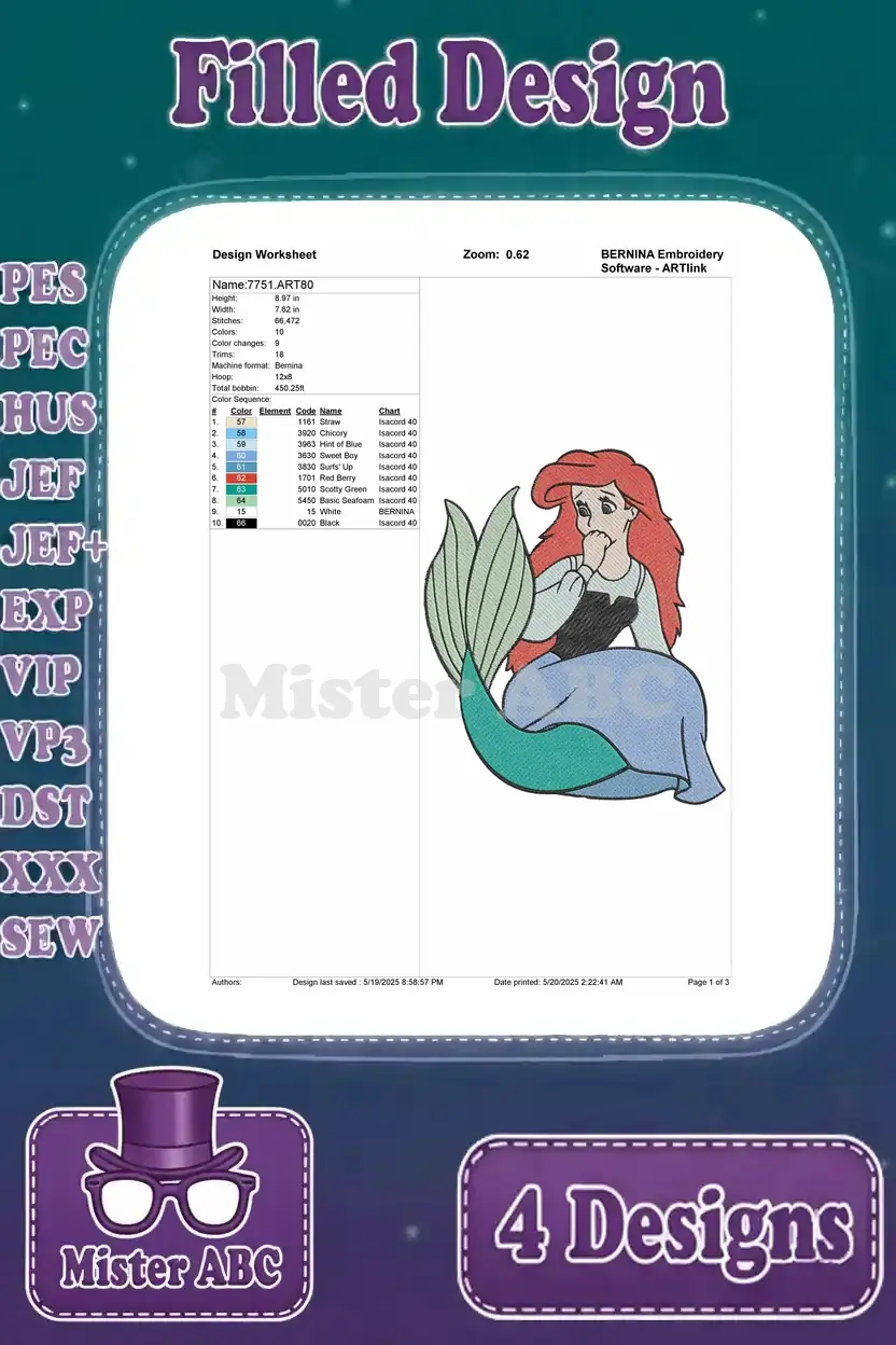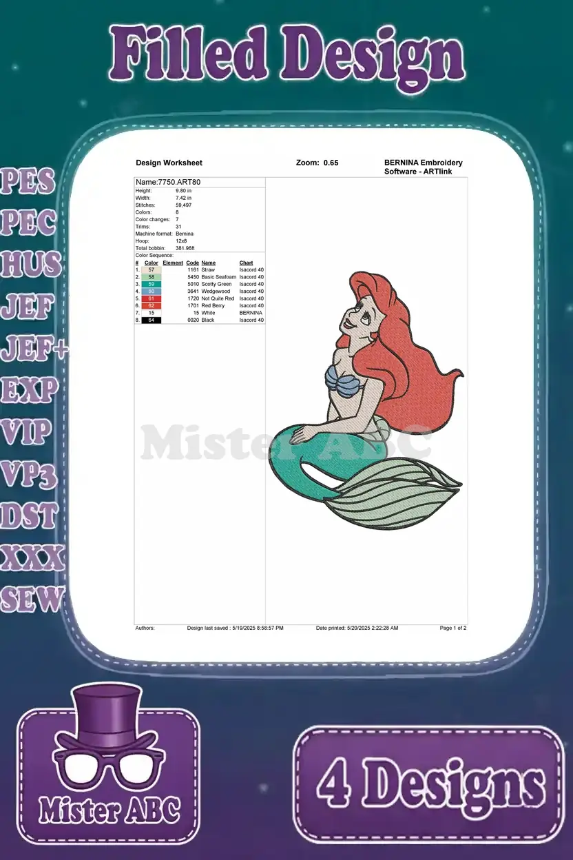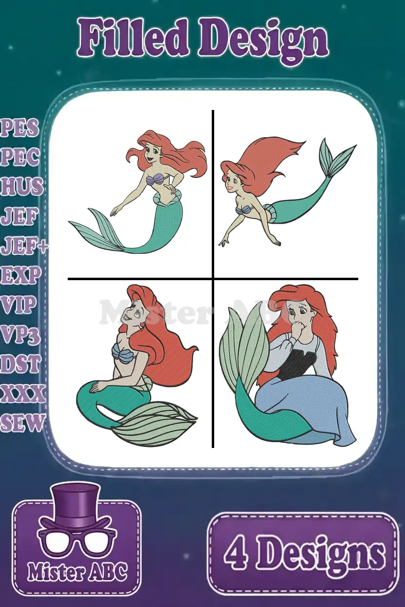 The Little Mermaid Ariel Various Swimming Poses Sitting On Rock And Human Form – Filled Embroidery Design