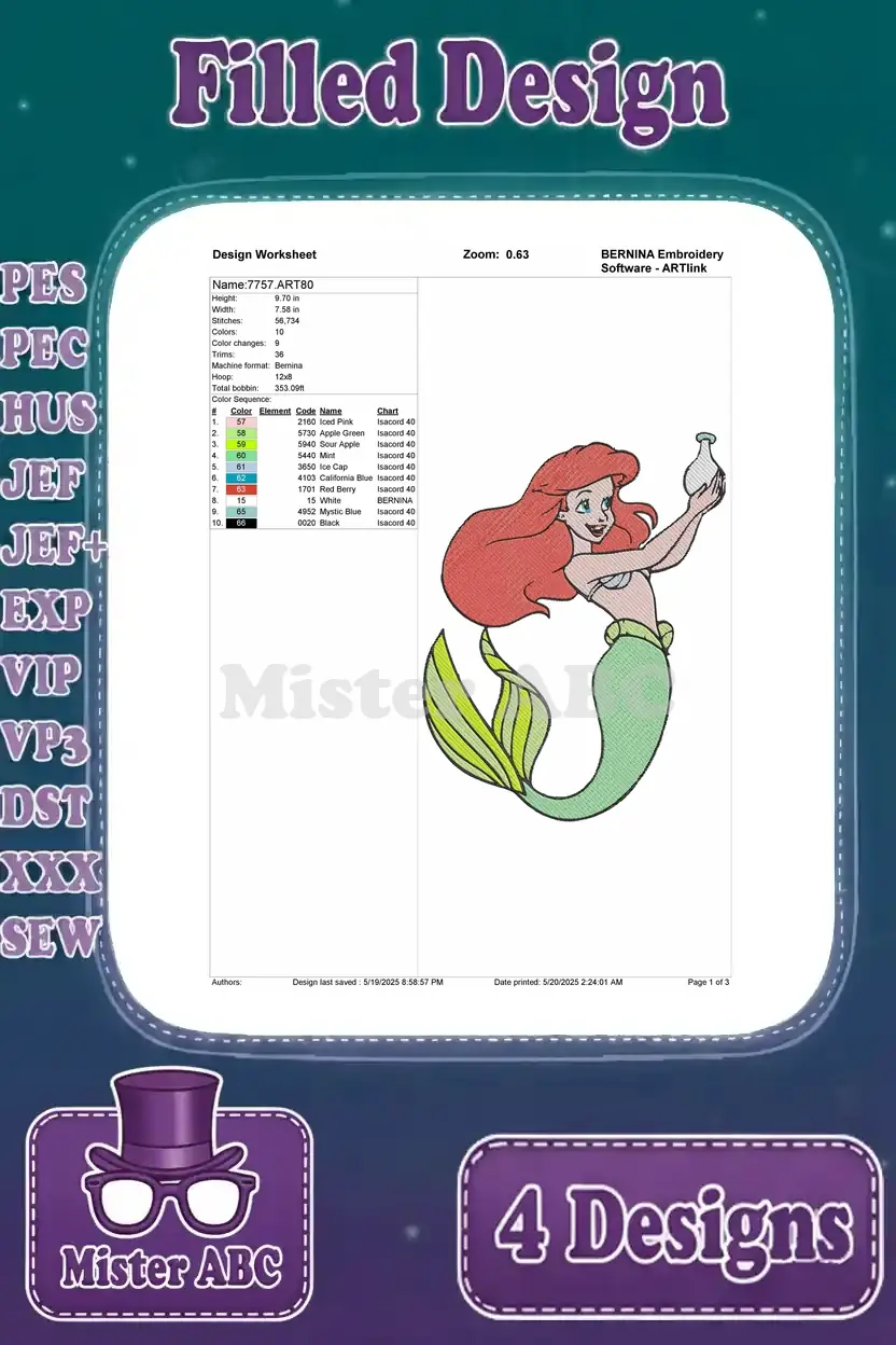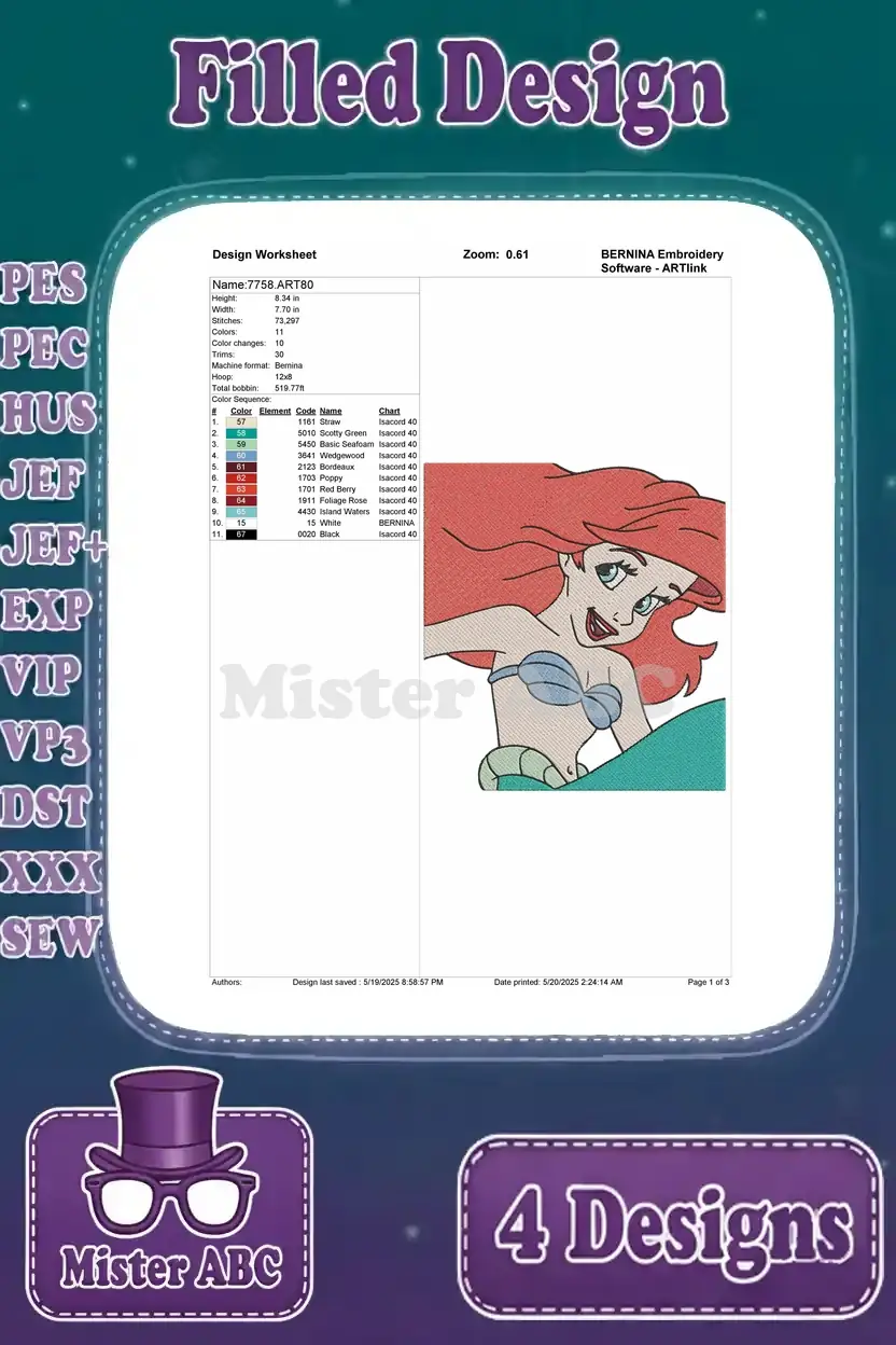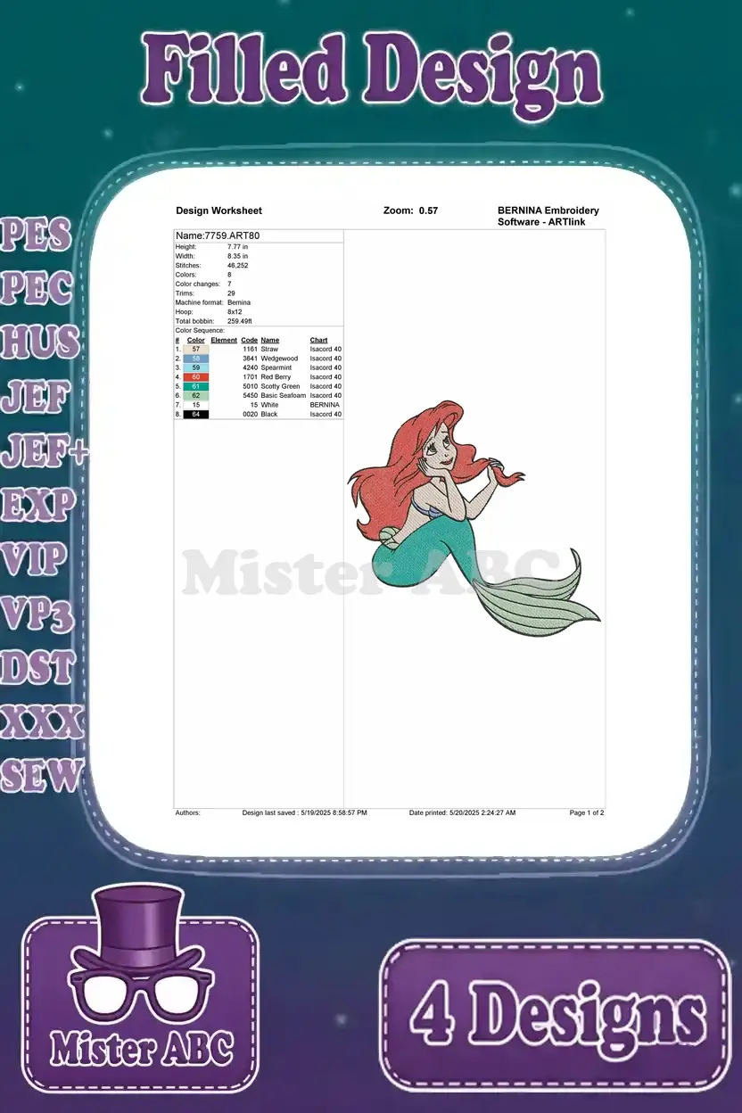 The Little Mermaid Ariel Various Portraits And Mermaid Poses With Mirror And Sitting – Filled Embroidery Design