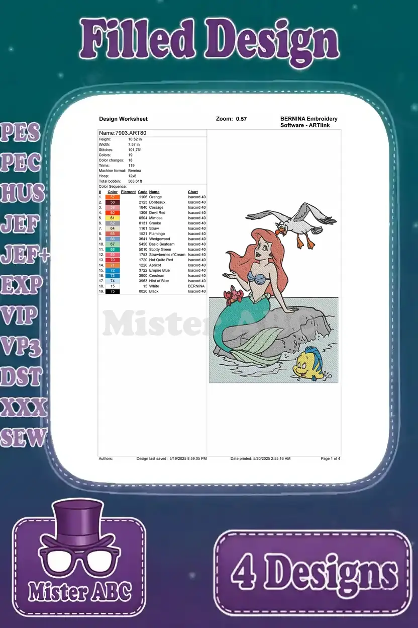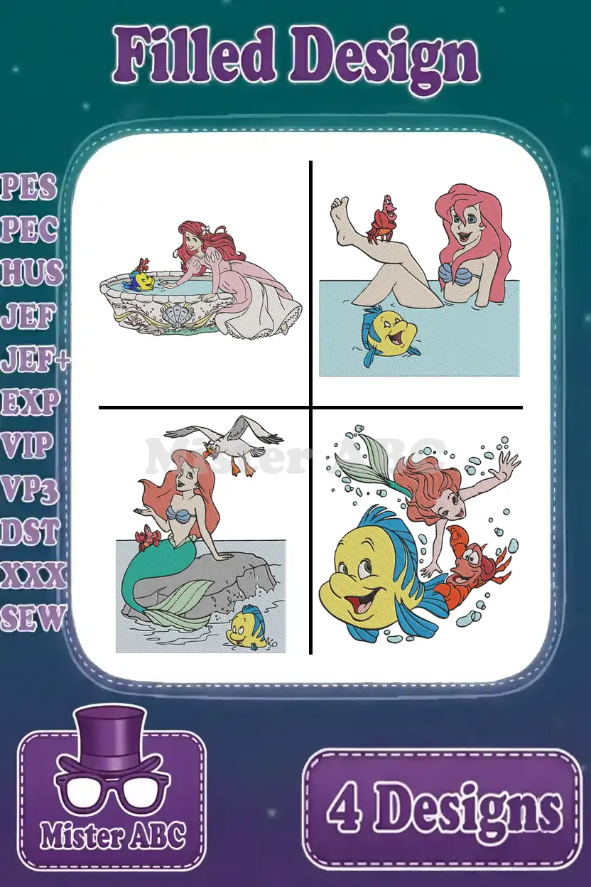 The Little Mermaid – Human Ariel With Sea Friends In Fountain – Scuttle Flounder Sebastian – Disney Fun – Filled Embroidery Design