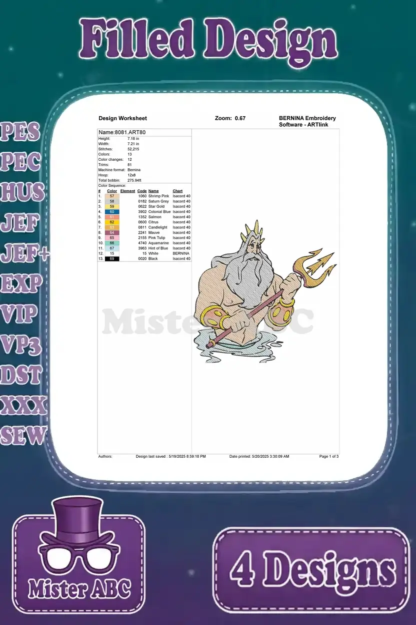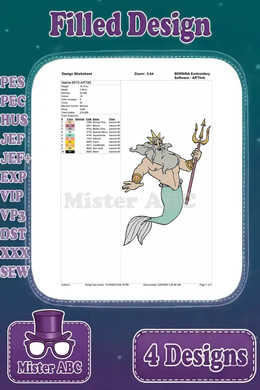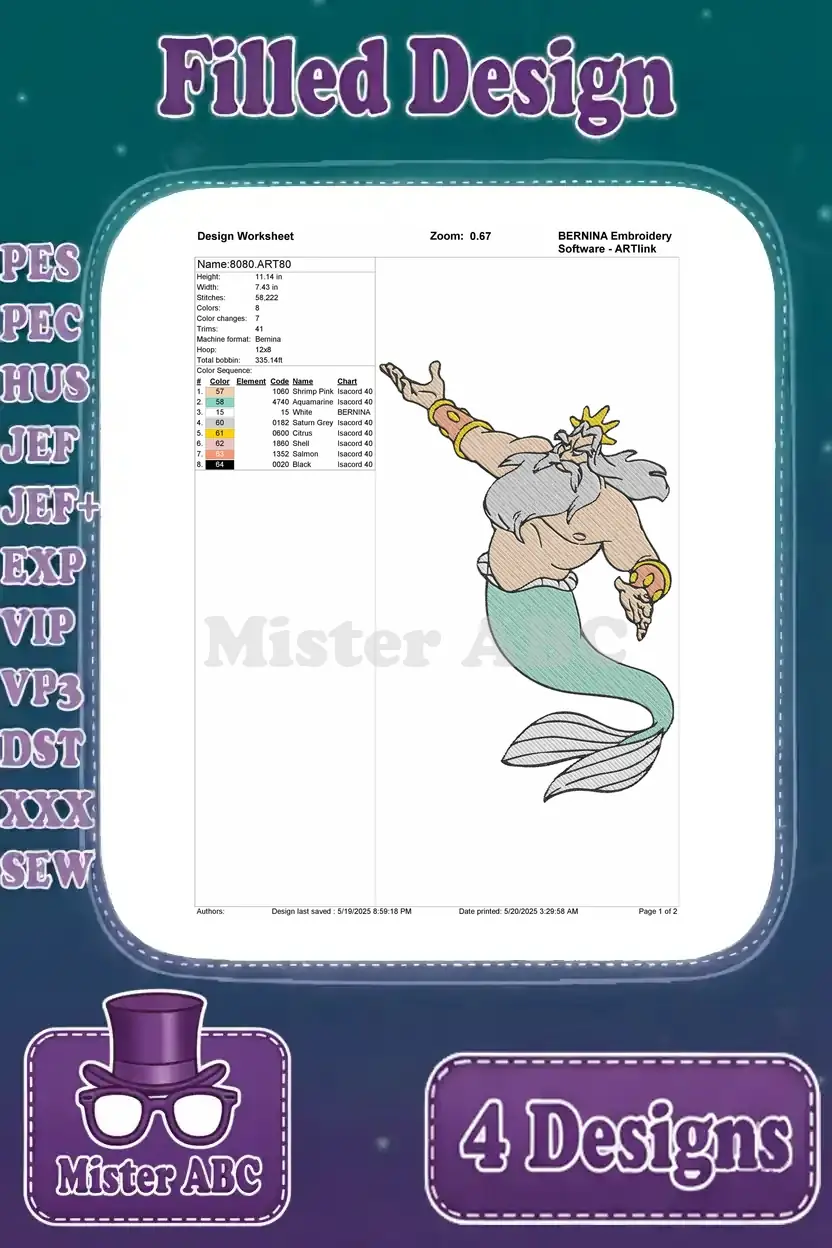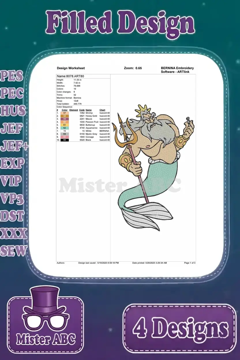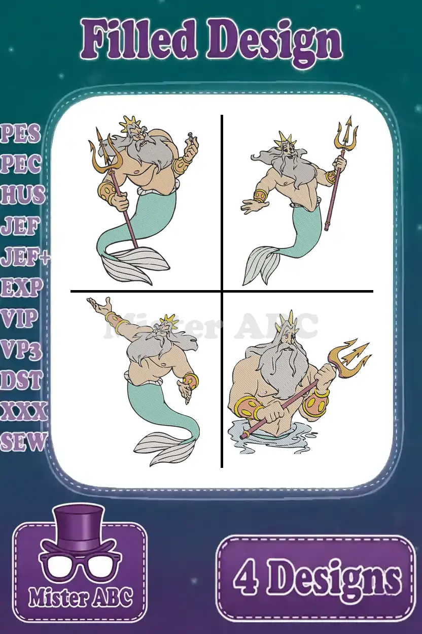The Little Mermaid King Triton With Trident Various Sitting And Thoughtful Poses – Filled Embroidery Design