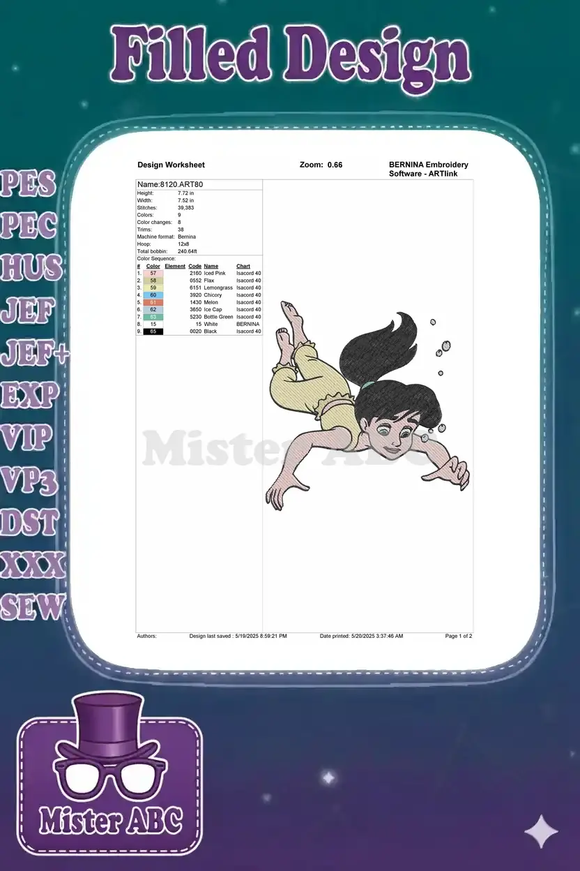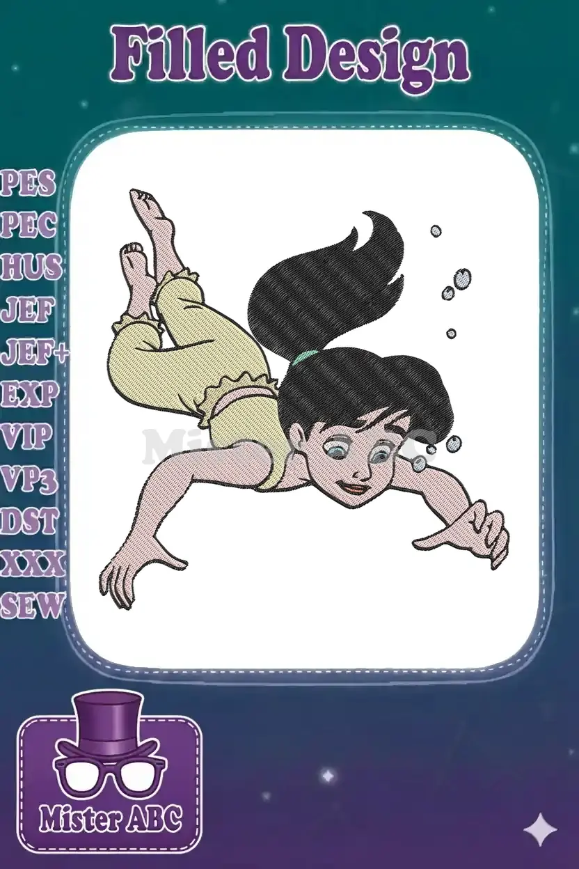 Dive into adventure with this delightful Melody embroidery design, capturing her joyful swim. Perfect for all fans!