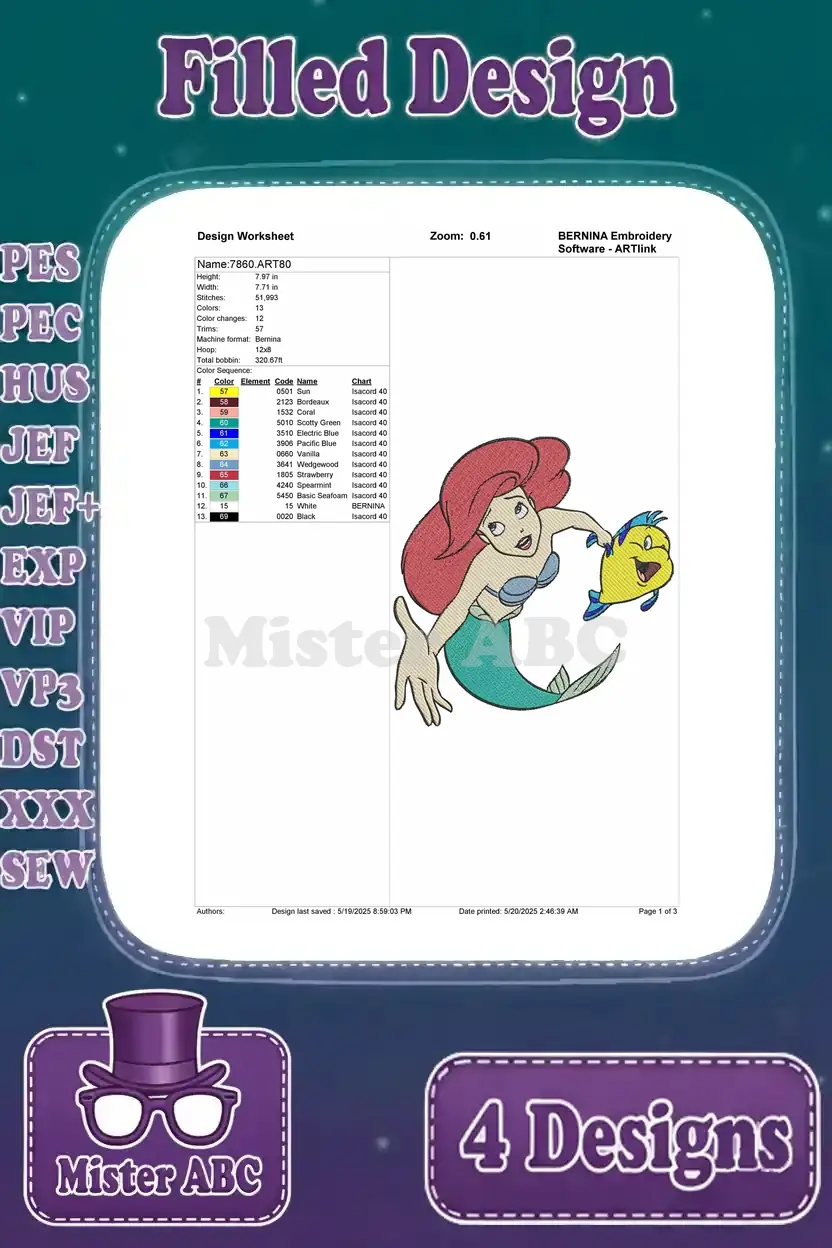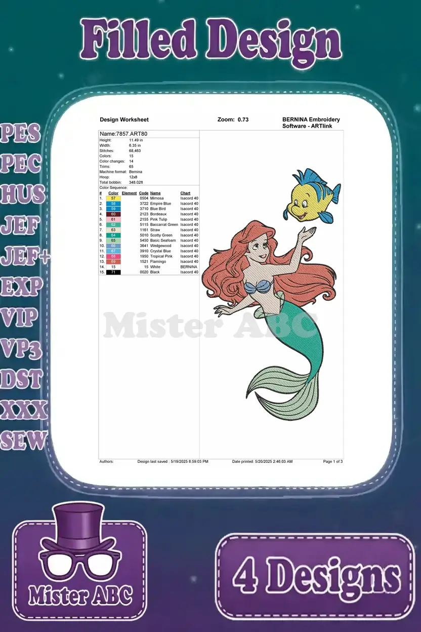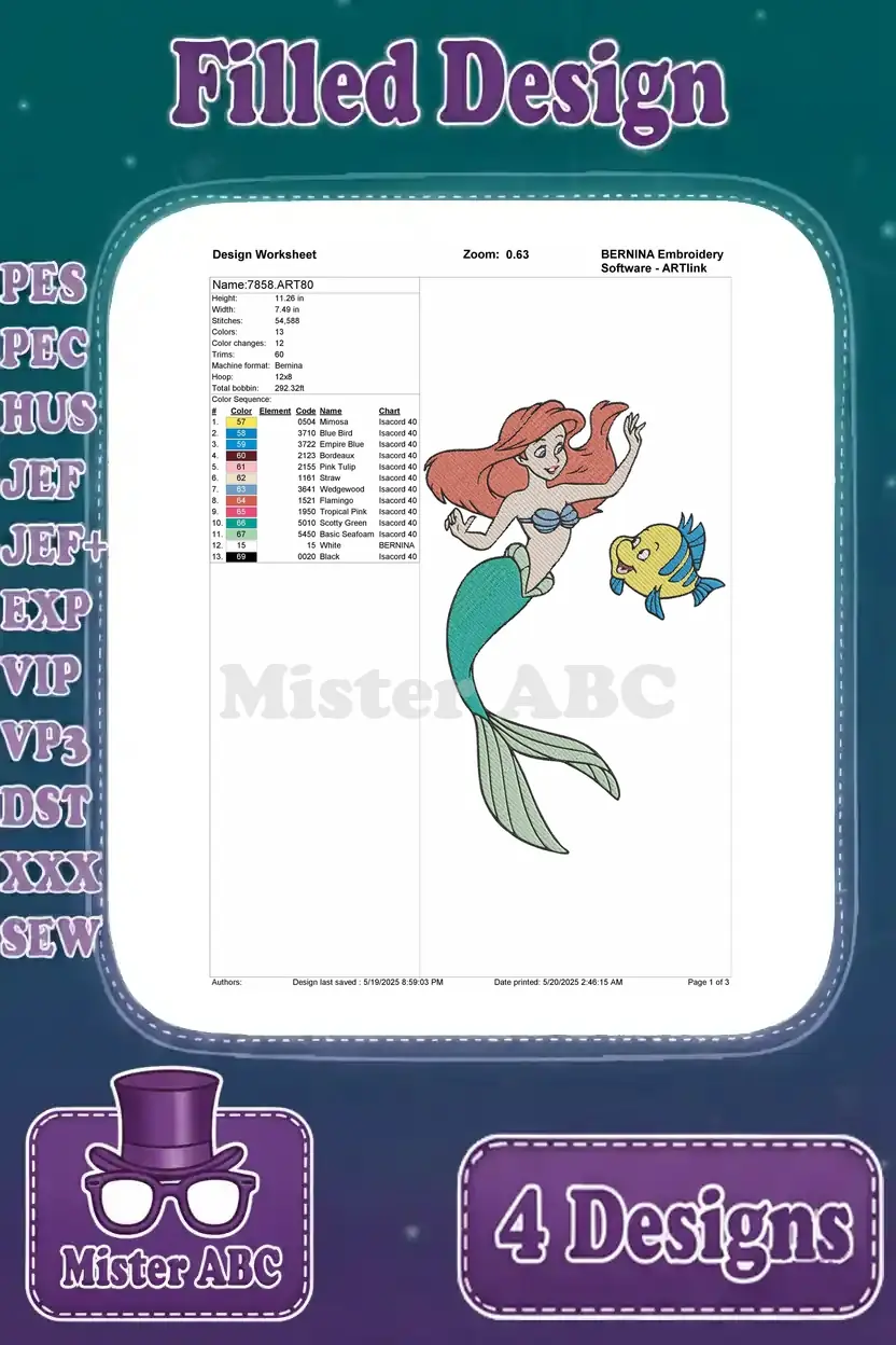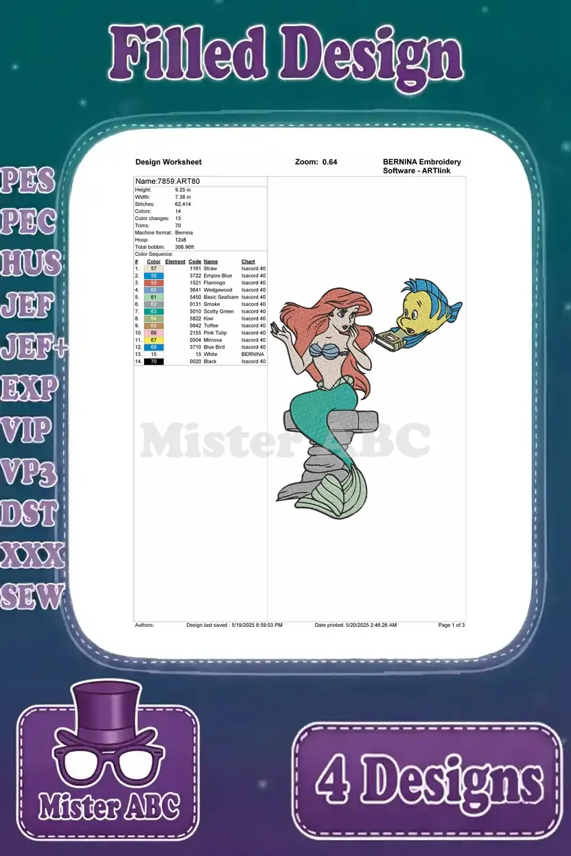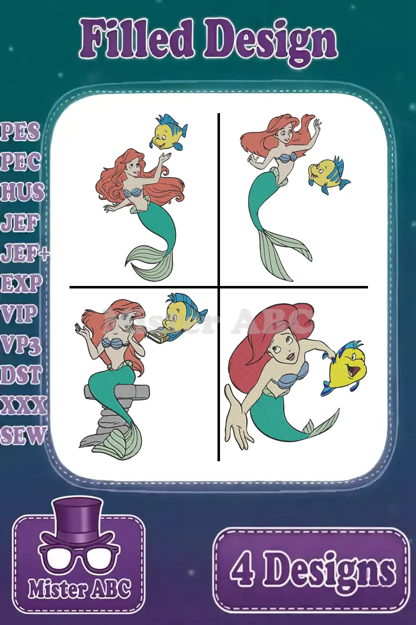 The Little Mermaid – Mermaid Ariel And Faithful Flounder – Multiple Swimming And Posing – Disney Pack – Filled Embroidery Design