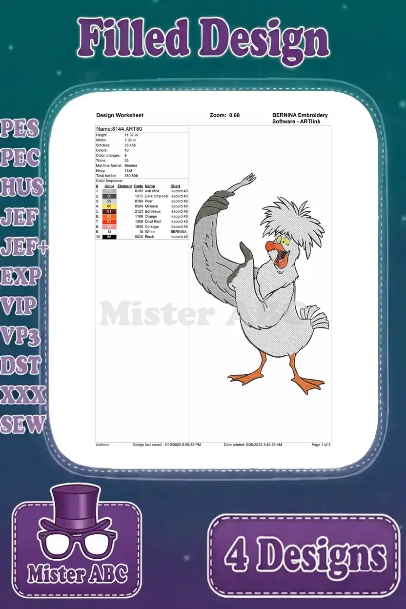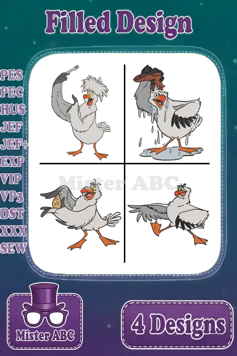 The Little Mermaid Scuttle The Seagull Various Standing And Confused Bird Poses - Filled Embroidery Design - 8146