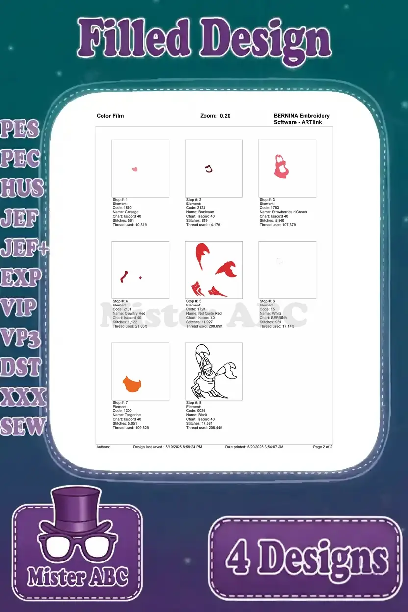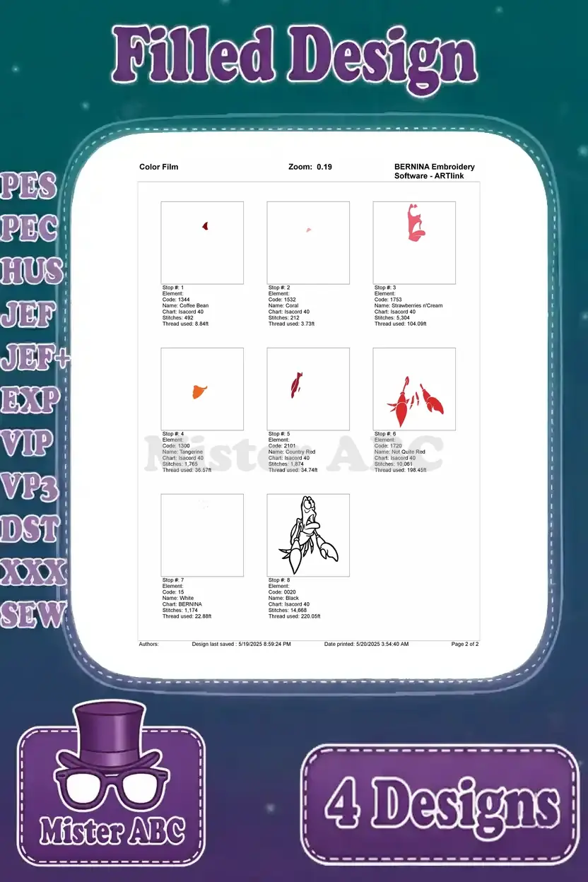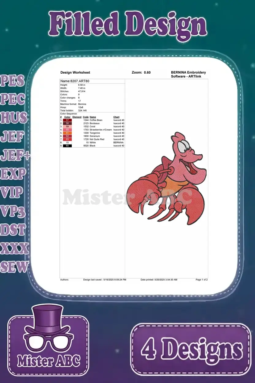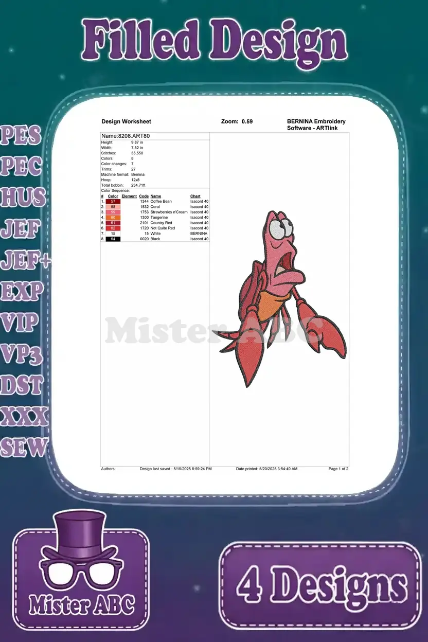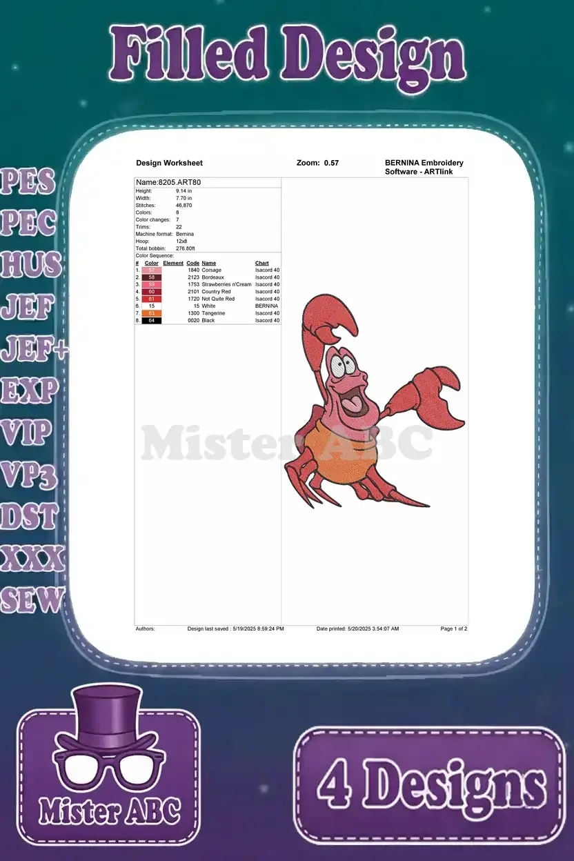 Dive into fun with this Sebastian embroidery bundle! Four vibrant filled designs capture the beloved crab’s charm and expressions for your projects.