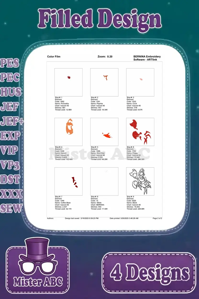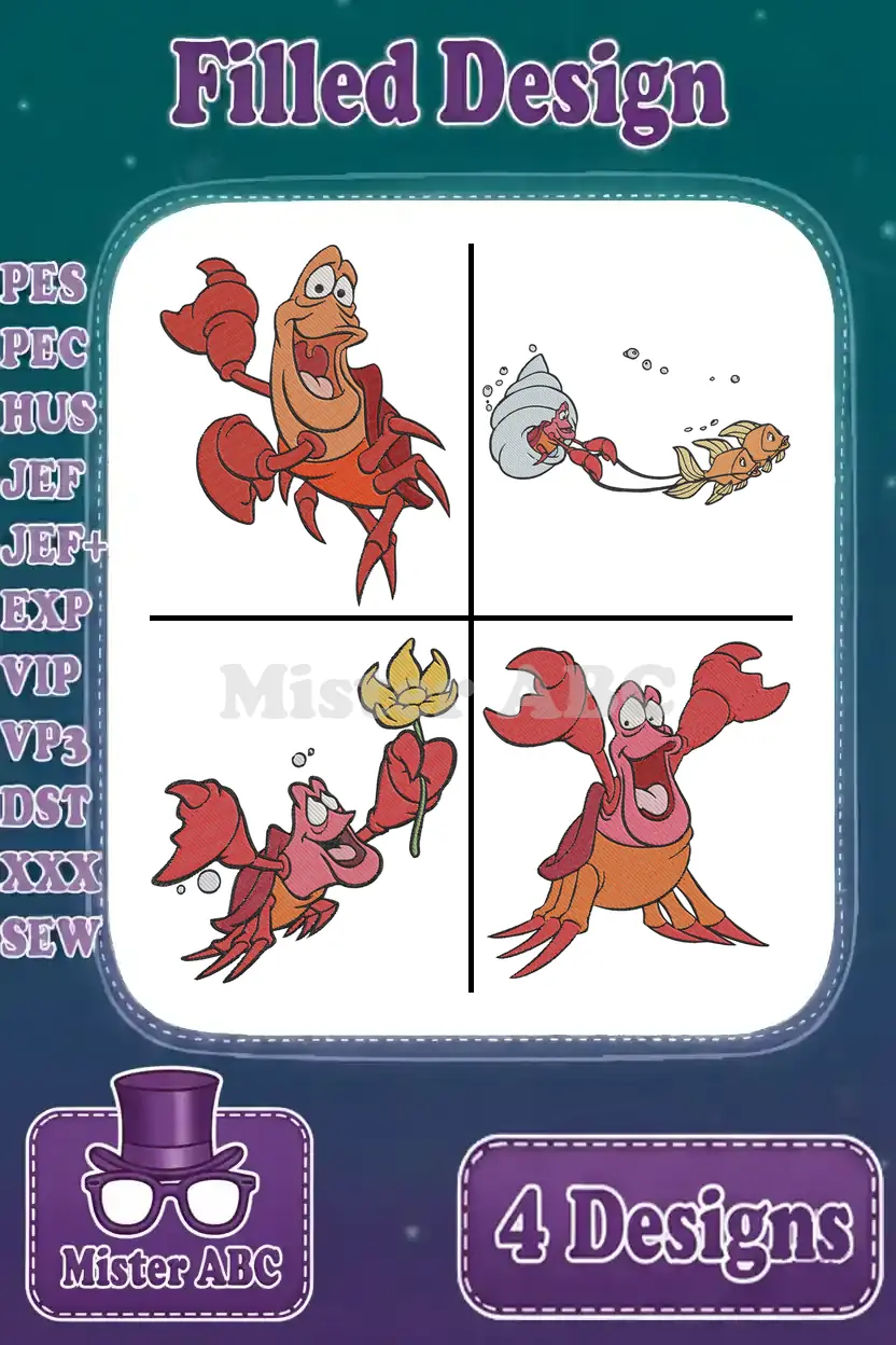 The Little Mermaid Sebastian Crab Various Poses With Goldfish And Crown Bubbles – Filled Embroidery Design