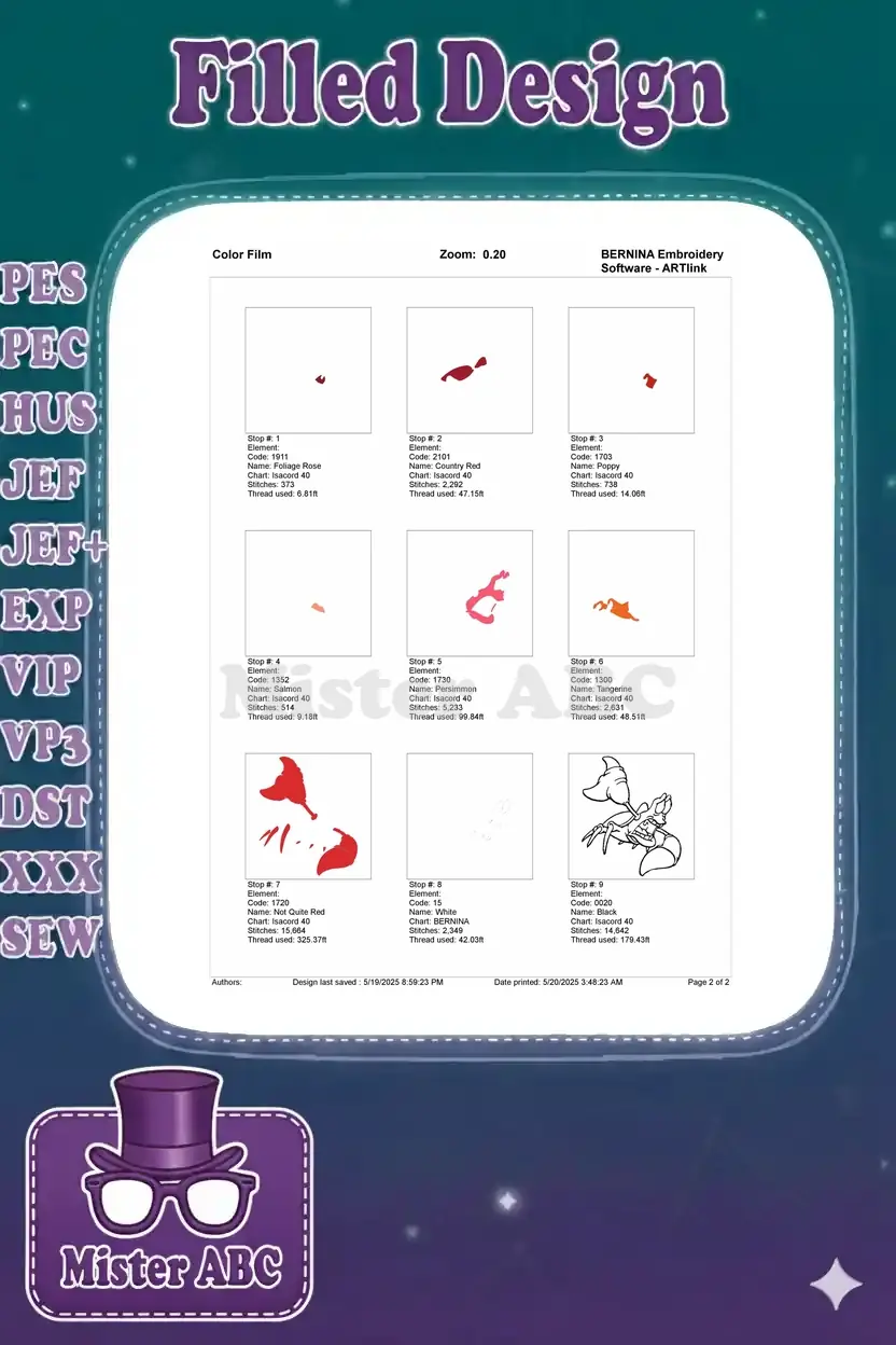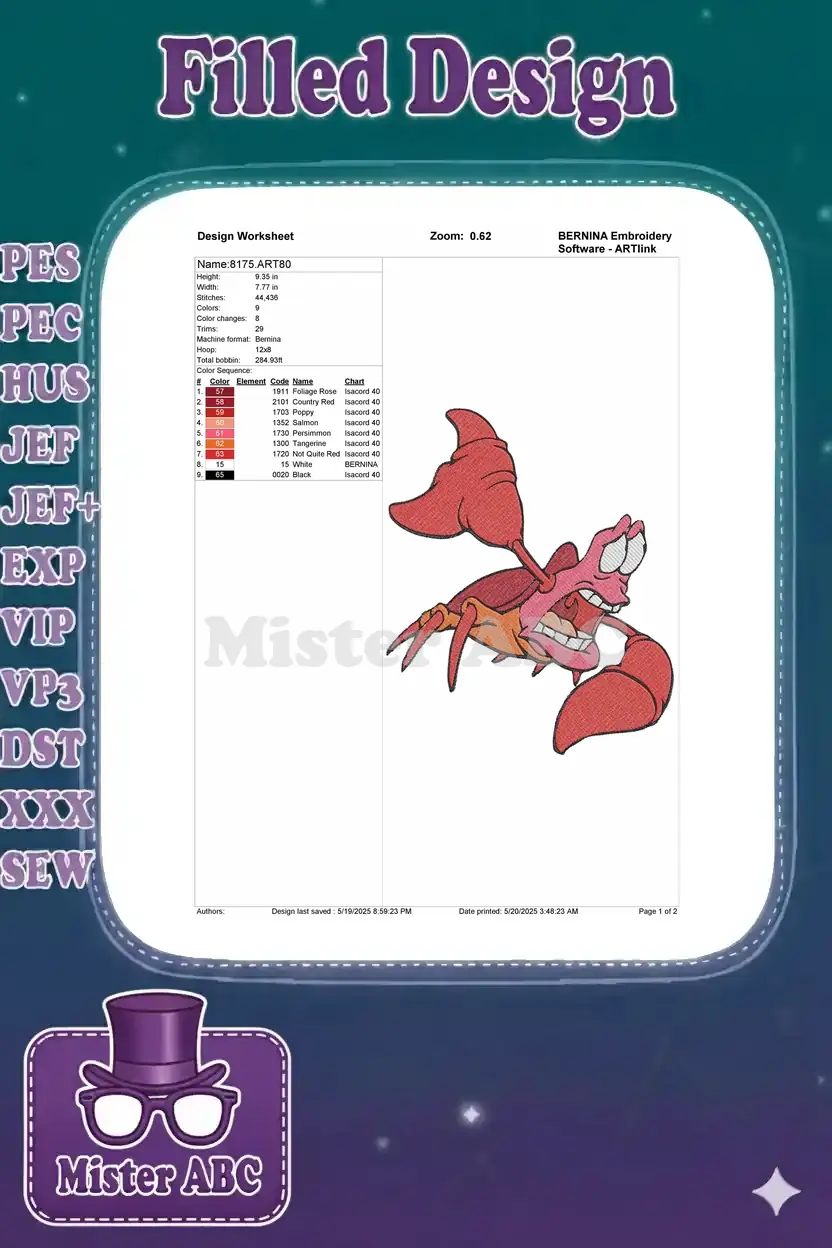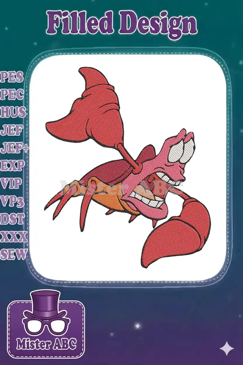 Vibrant Sebastian crab embroidery design, perfect for Disney fans. Add a touch of underwater magic to your projects!