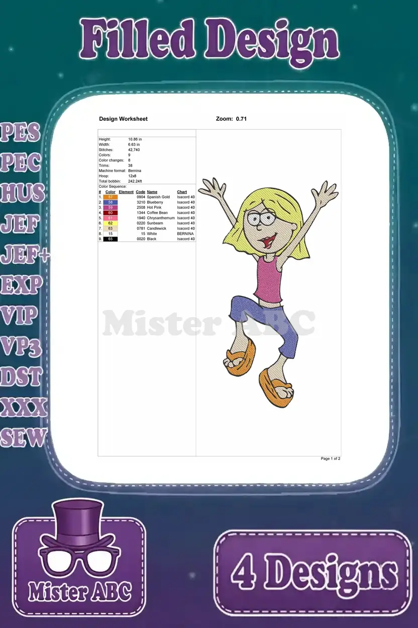Lizzie Mcguire Animated Lizzie Jumping Ice Cream Reading And Relaxing Poses – Filled Embroidery Design