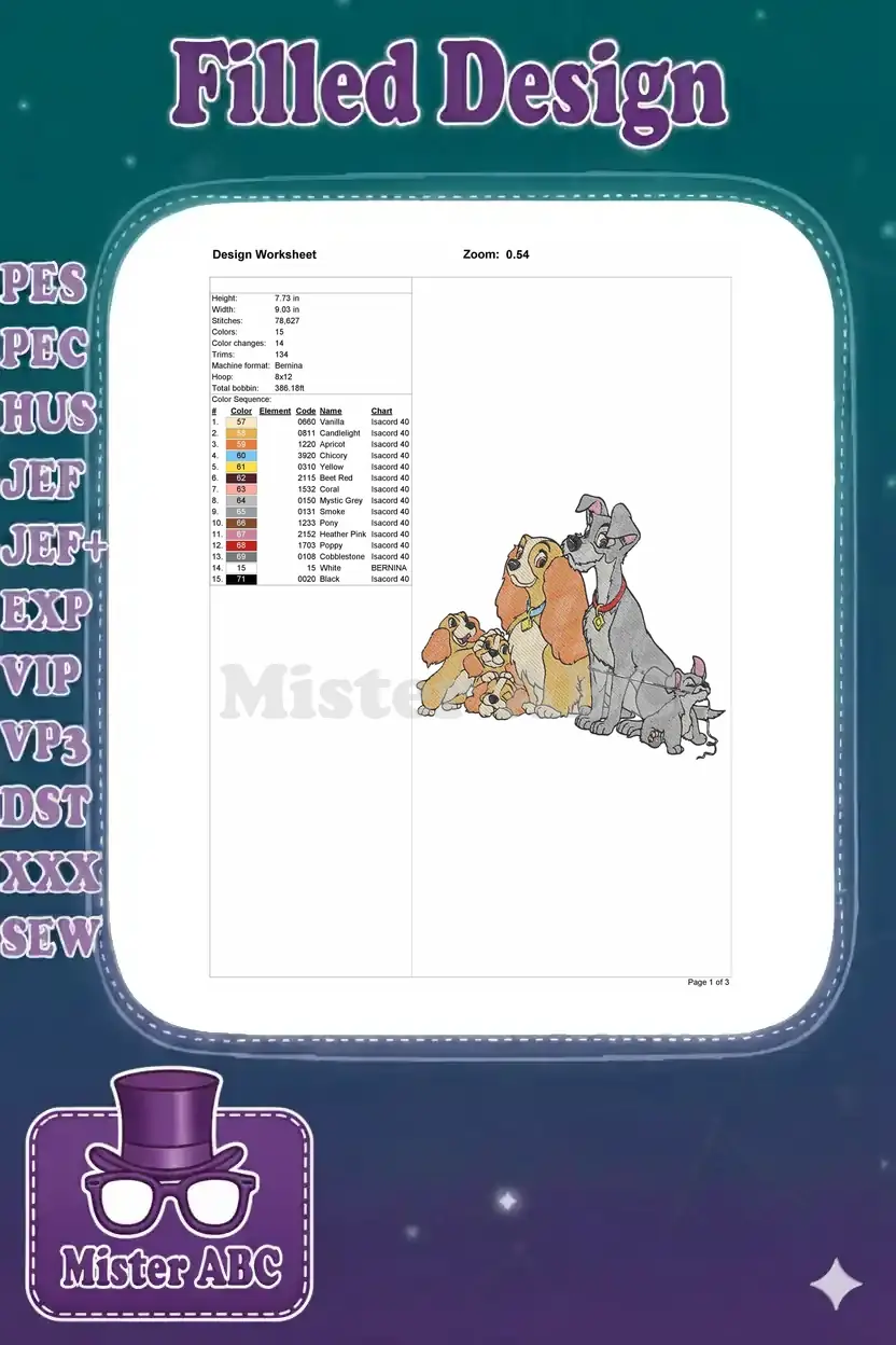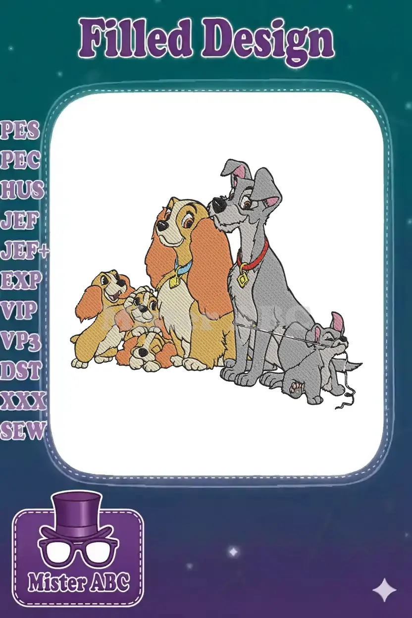 Lovable Lady and Tramp with Puppies Disney embroidery designs