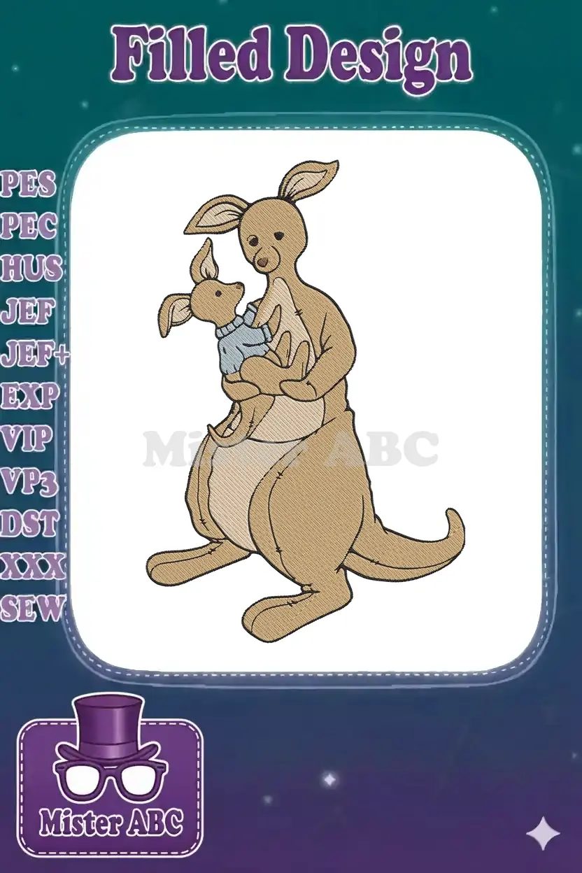 A heartwarming embroidery design featuring Kanga and Roo, capturing their loving bond, perfect for children’s items and Winnie the Pooh fans.