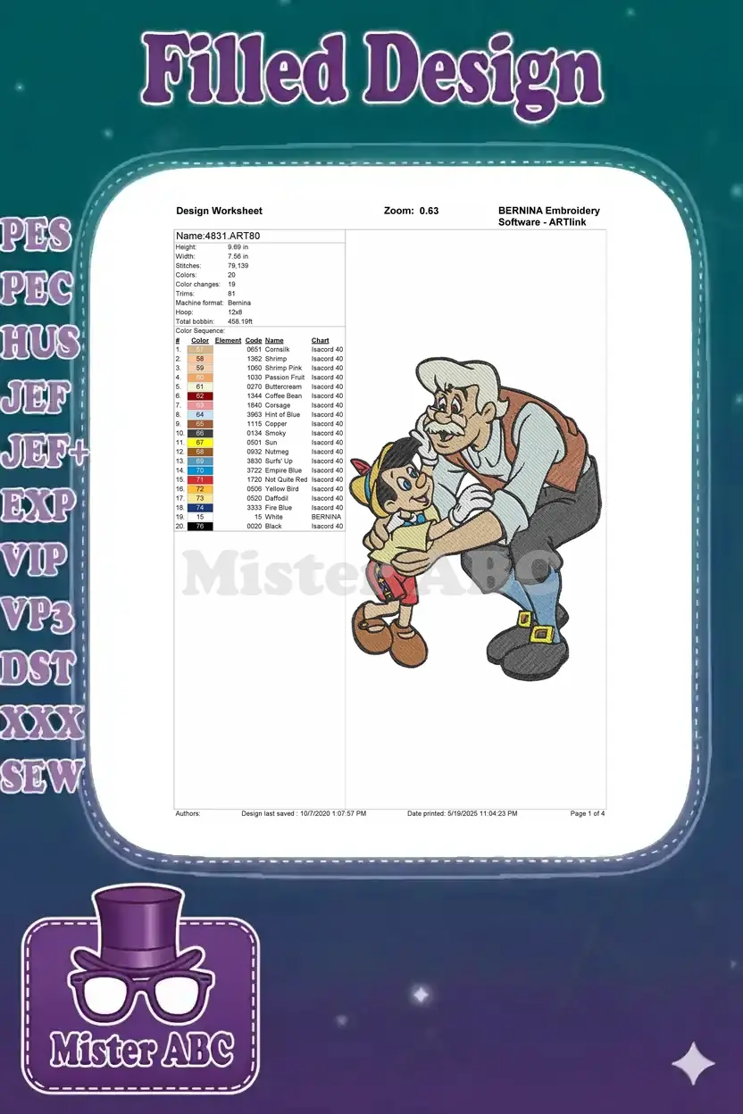 Loving Pinocchio and Geppetto father-son hug classic storybook embroidery designs
