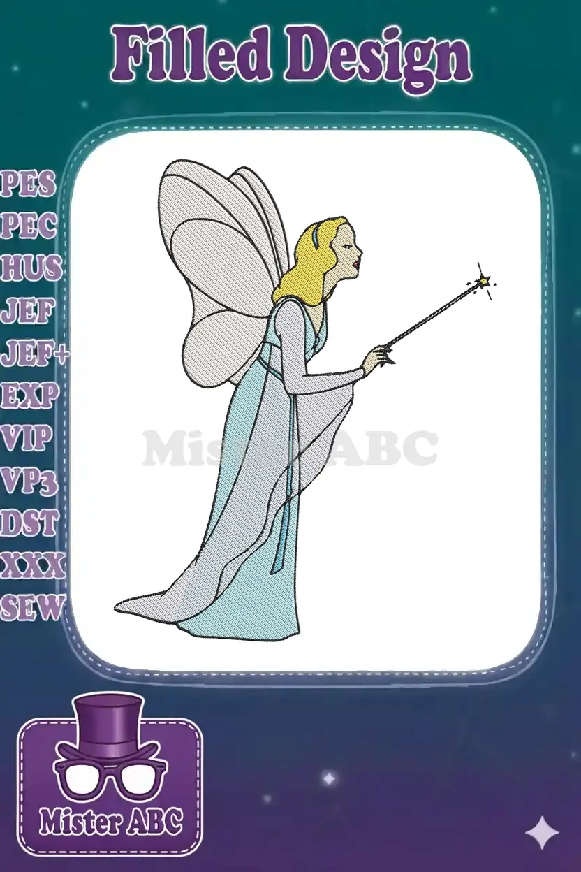 Magical blonde fairy with wand and shimmering wings embroidery designs