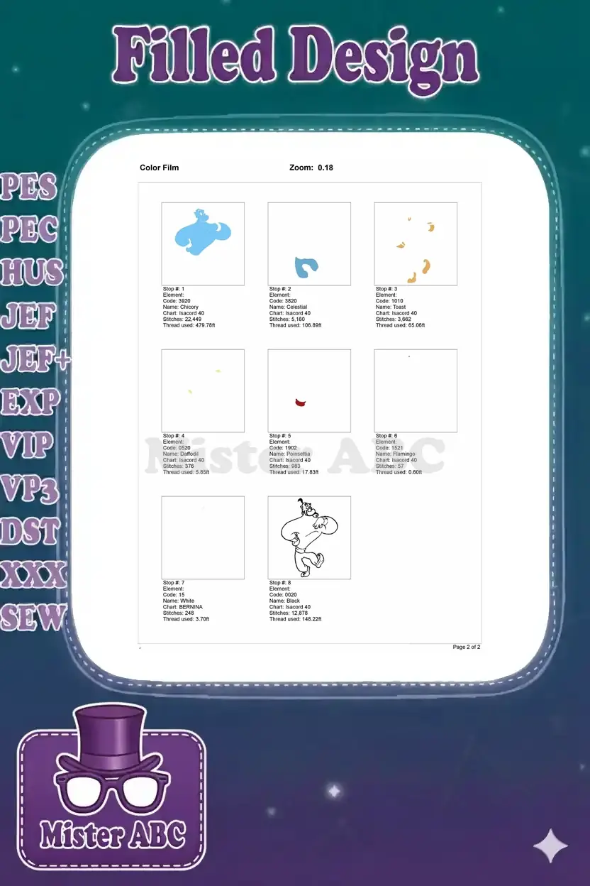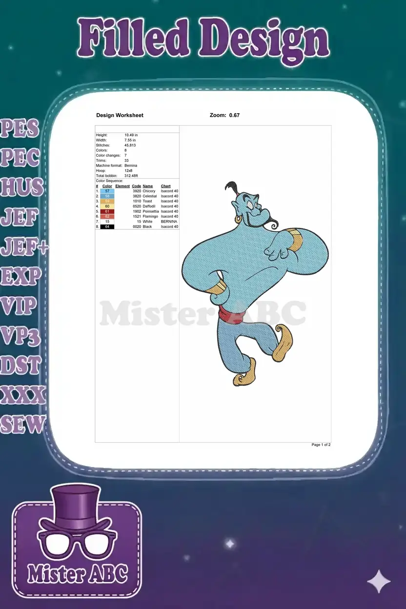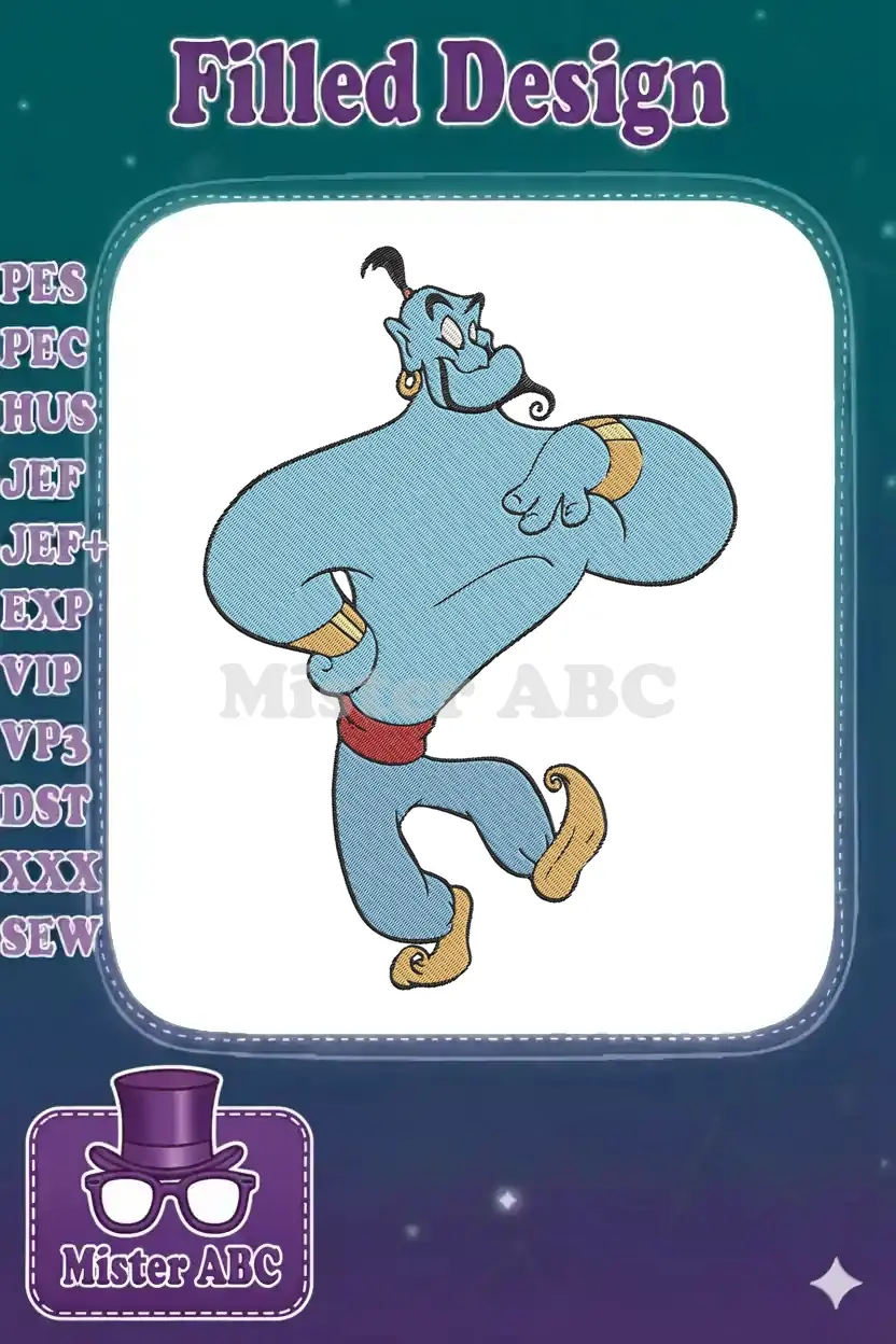 Bring the magic of Agrabah to life with this vibrant Genie embroidery design! Perfect for Disney fans and crafters.