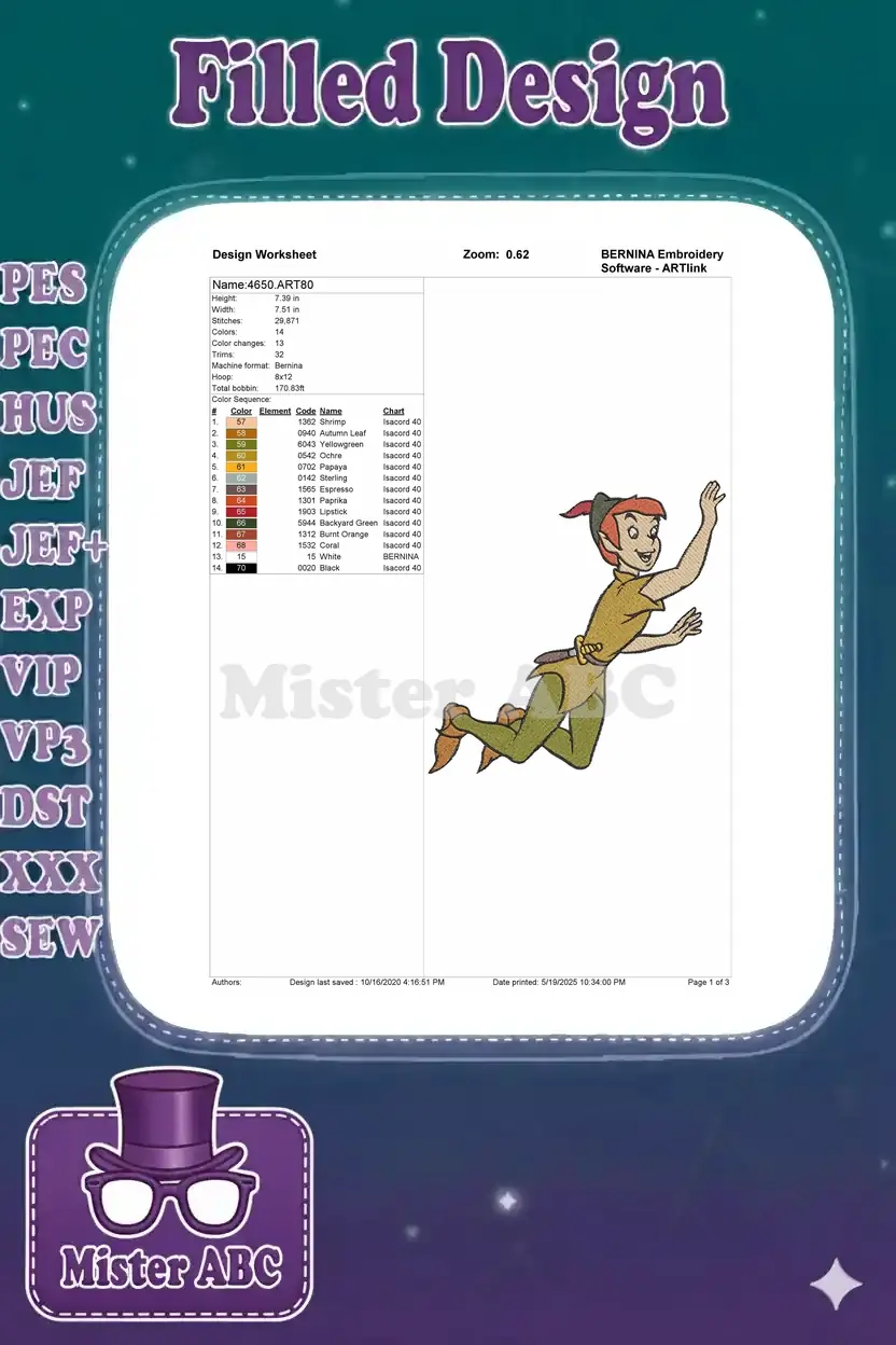 Magical Flying Peter Pan Cartoon Character Embroidery Designs for Kids