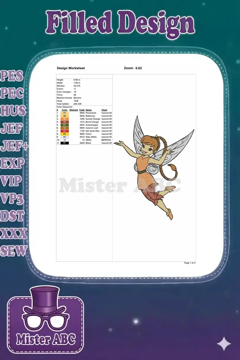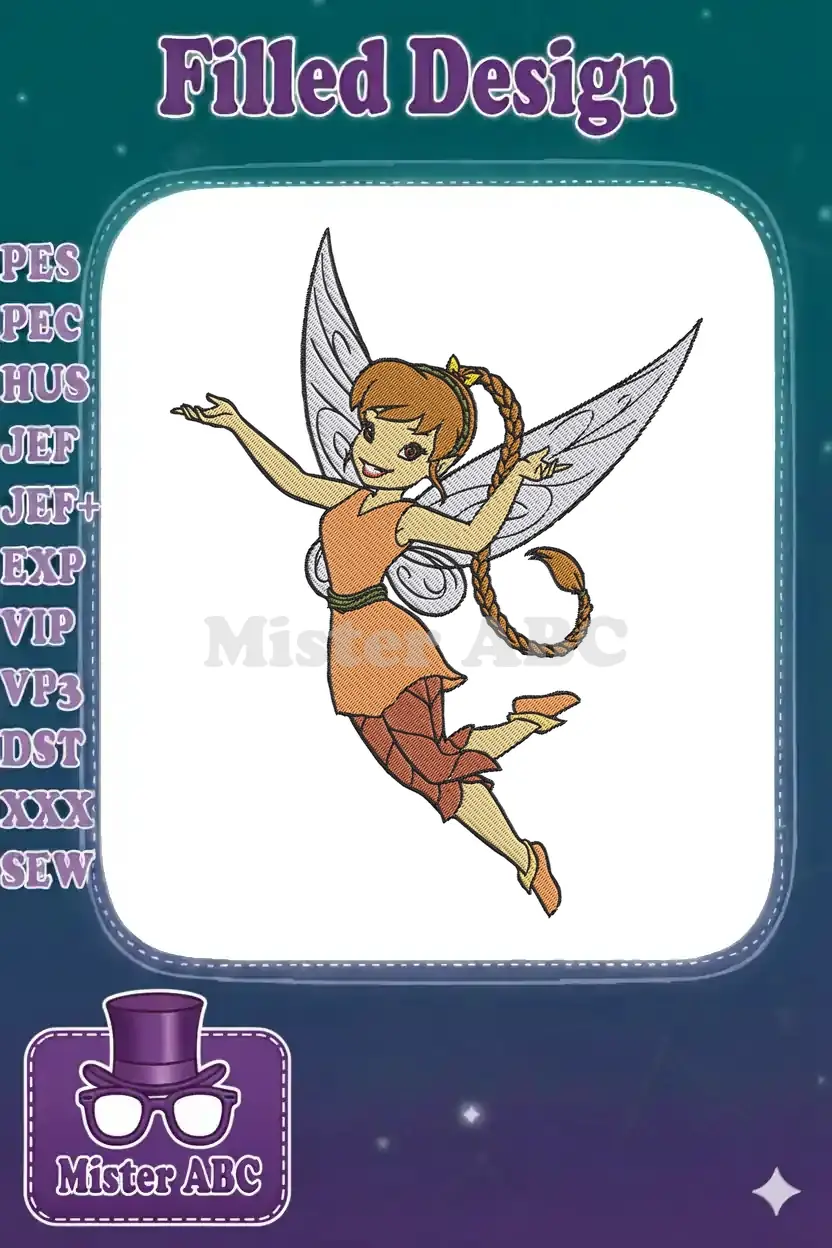 Magical flying pixie with orange dress and braid embroidery designs