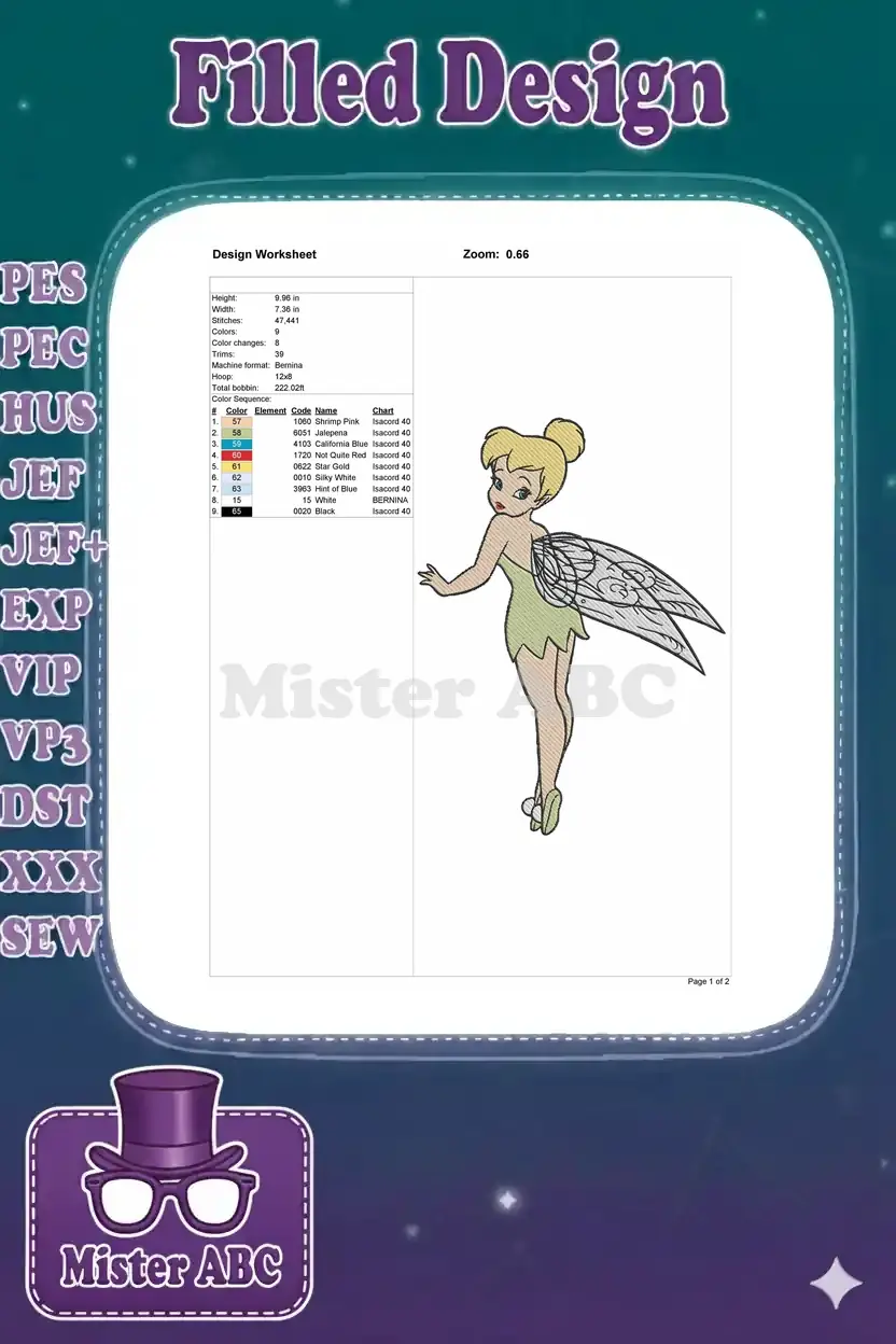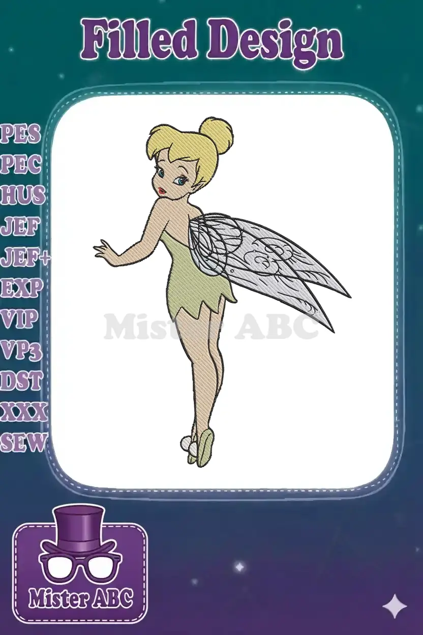 Magical Tinkerbell fairy with green dress and wings embroidery designs