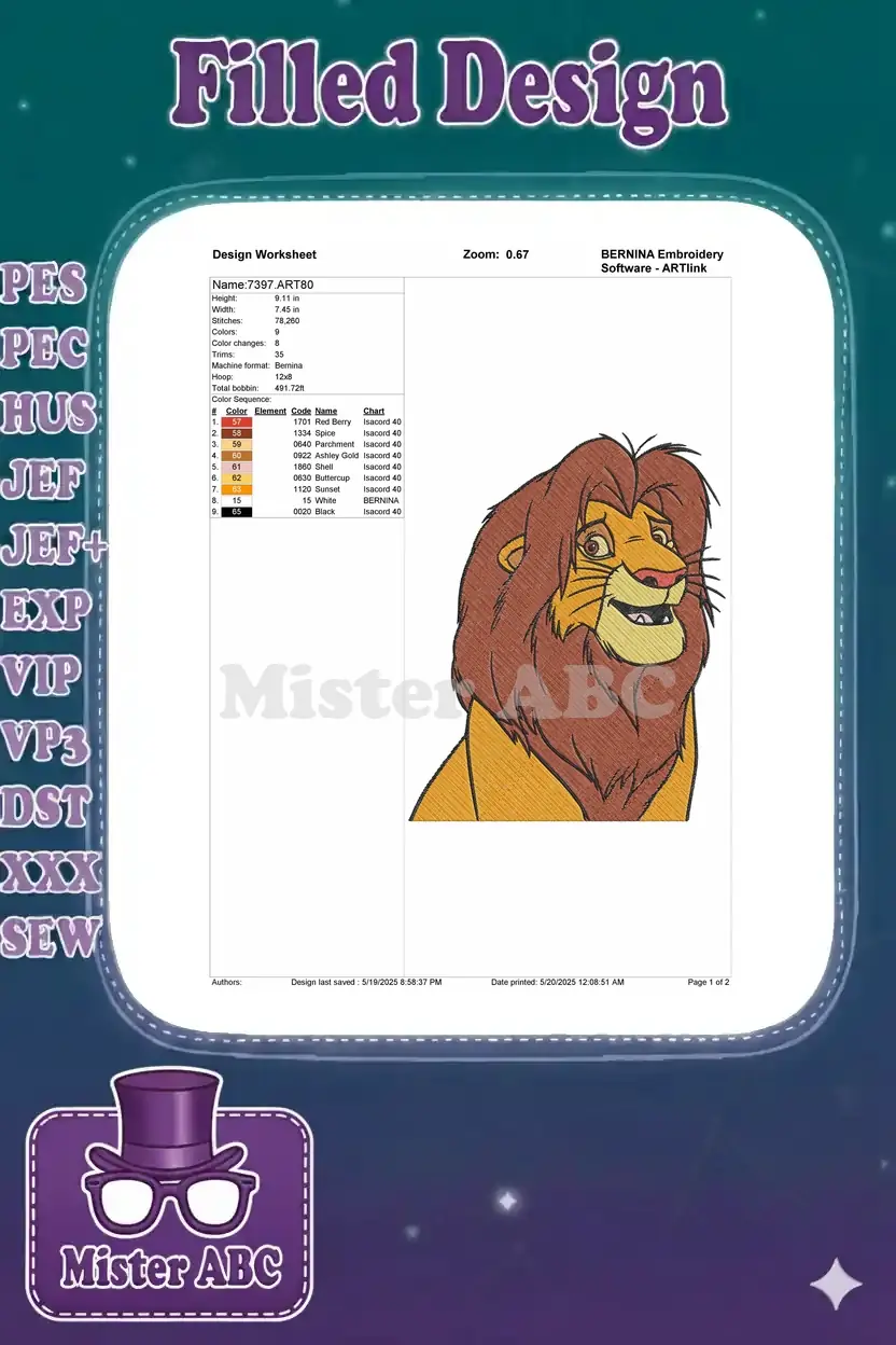Bring the classic charm of Simba to your projects with this vibrant embroidery design. Perfect for fans of the Lion King.